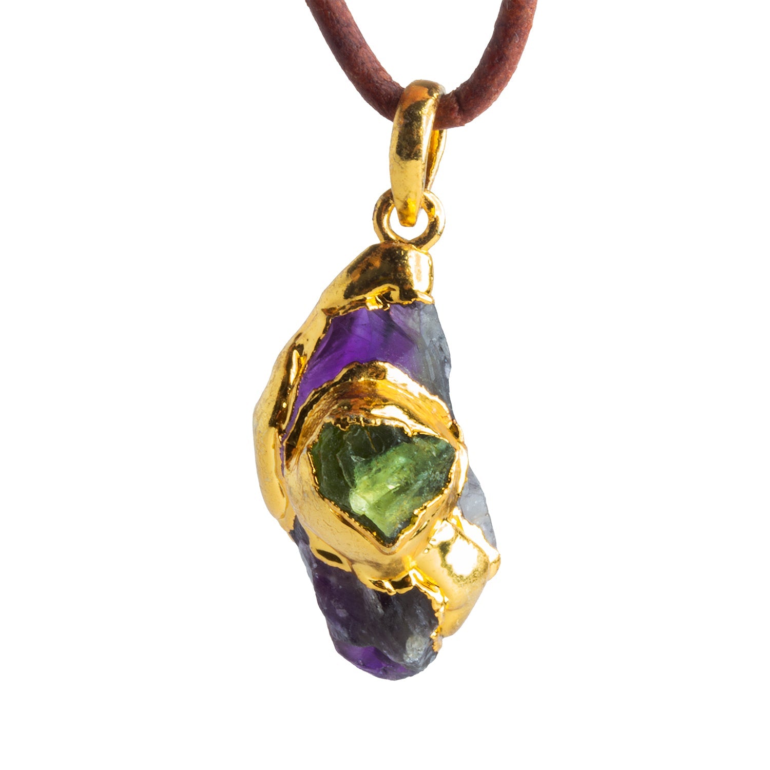 Rich violet Amethyst forms the natural crystal base of this striking pendant, accented with a vibrant green Peridot embraced in flowing gold leafing. The contrast between deep purple and luminous green creates a bold yet harmonious palette, while the raw edges and organic contours of the crystal preserve its natural texture and depth. Light reflects beautifully off the polished gold surface, enhancing both gemstones and giving the piece a dimensional, sculptural presence.