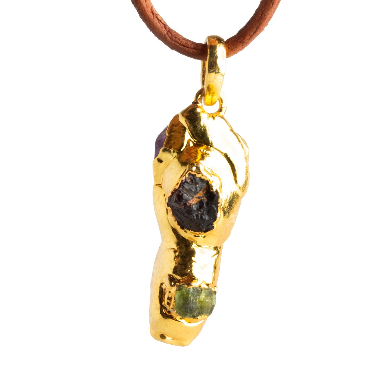 A natural shard of richly toned Amethyst forms the elegant foundation of this pendant, its deep violet hues peeking through flowing gold leafing that wraps organically along the stone’s surface. Set into the warm metallic finish are two vibrant accents: a wine-toned Garnet with earthy depth and a fresh green Peridot that adds a lively pop of color. The contrast between purple, red, and green creates a striking, jewel-toned palette with dramatic dimension.