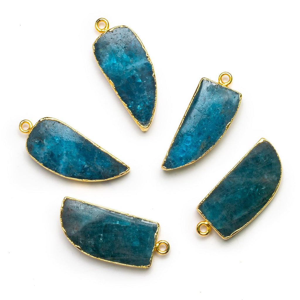 Beads average about 31x13mm. These pendants show off a vibrant, Neon Blue Apatite color that looks amazing enveloped in our signature gold leaf.