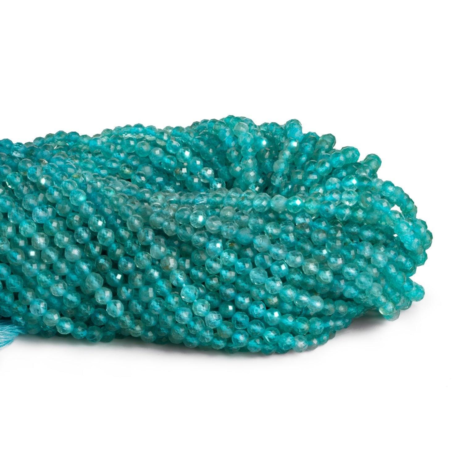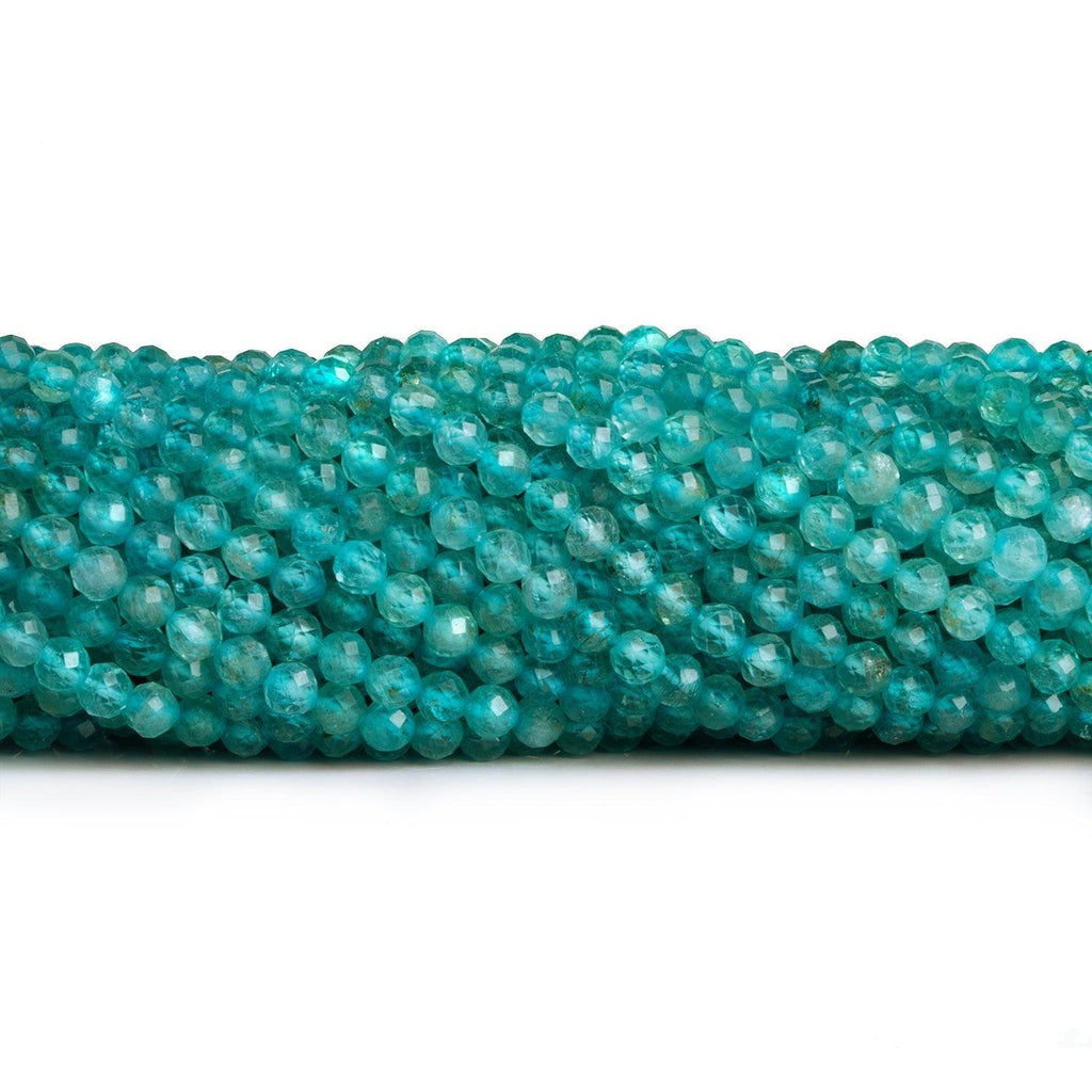 Beads measure 4mm in diameter with very little variation. These excellent microfaceted pieces feature a dazzling neon-blue Apatite coloration that is highly consistent across the strand. These sizable, 4mm designs are sure to be a hit with all fans of microfaceted beads!