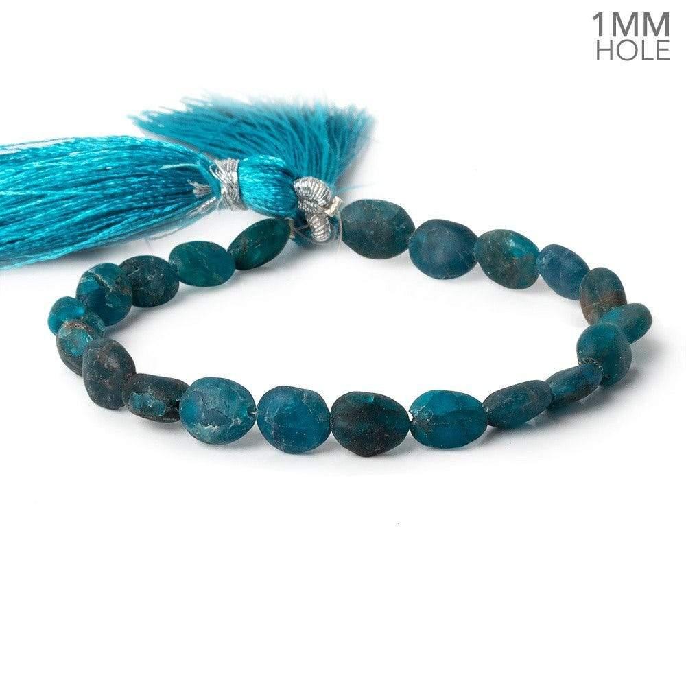 8x6-10x7mm Matte Neon Blue Apatite unfaceted ovals have moderate internal characteristics within their bodies exhibiting very deeply saturated strong greenish blue hues showing a semi-translucent quality on these smooth beads with varied quality and tone on the strand have a 1mm drill hole.