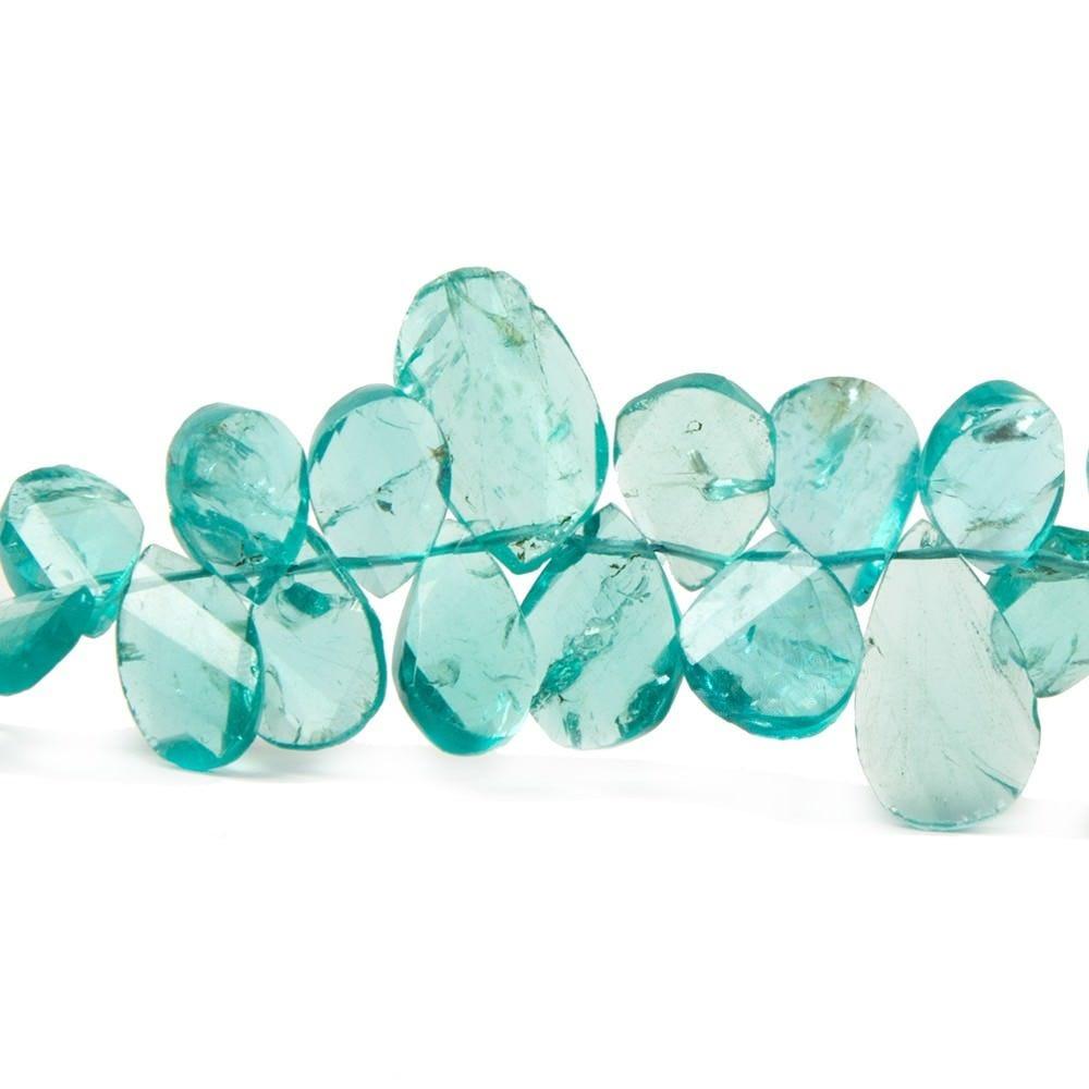 Beads measure about 9x7-13x7mm. Apatite Twist Faceted Pears exhibit vitreous luster, have excellent cut and polish, good matching on strand, good symmetrical shapes, and bodycolor is a medium Caribbean Blue with internal characteristics.