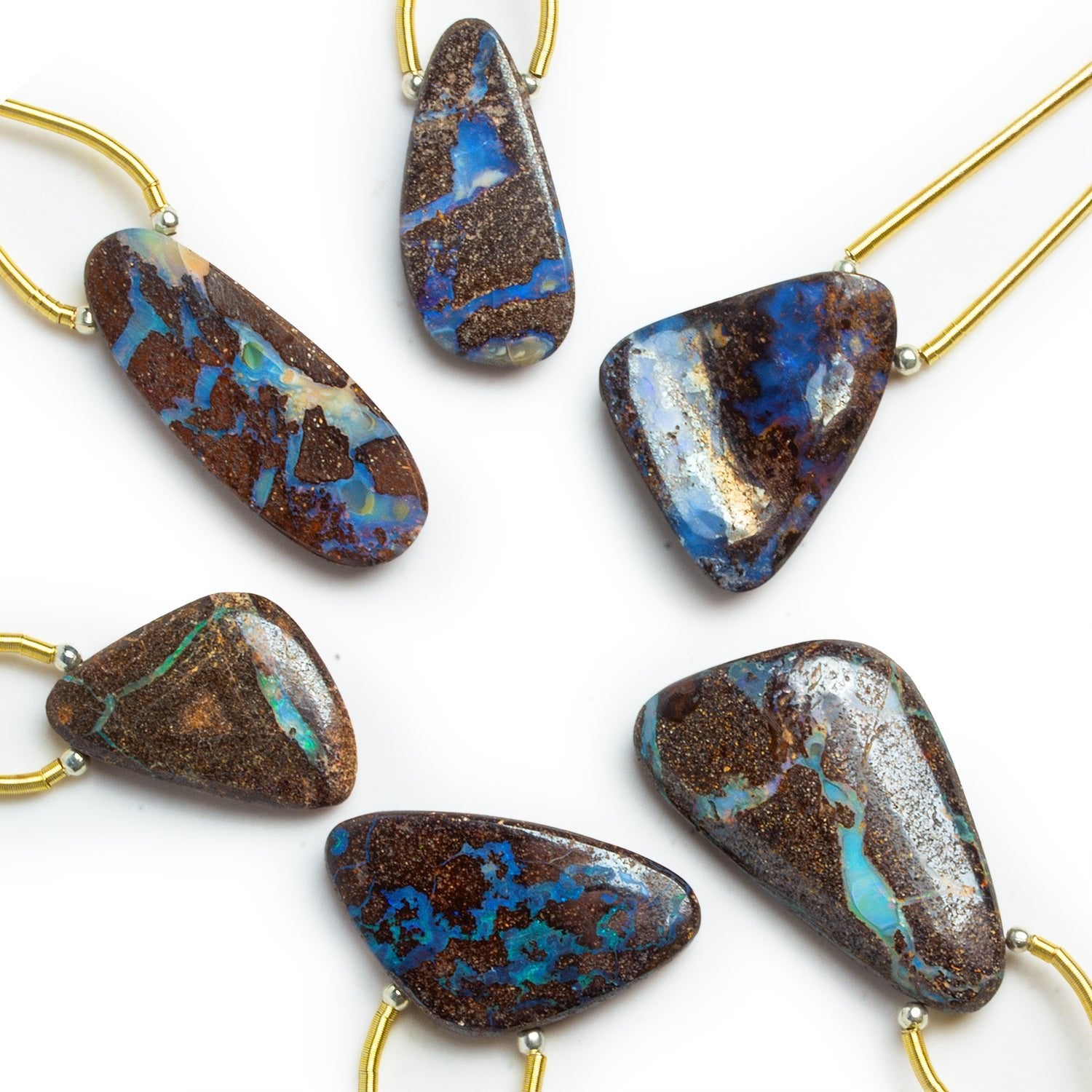 These Australian Boulder Opal Nugget Focal Beads, averaging 30x17mm, offer a striking mix of earthy richness and vibrant fire. Each bead showcases unique veins and pools of electric blue, violet, and amber flashing through natural brown ironstone—a geological canvas millions of years in the making.