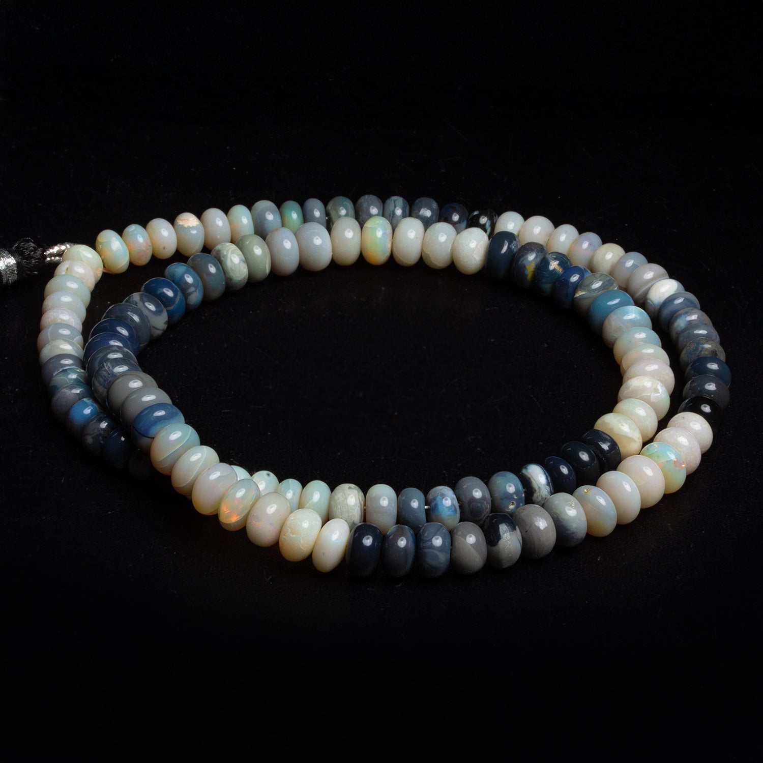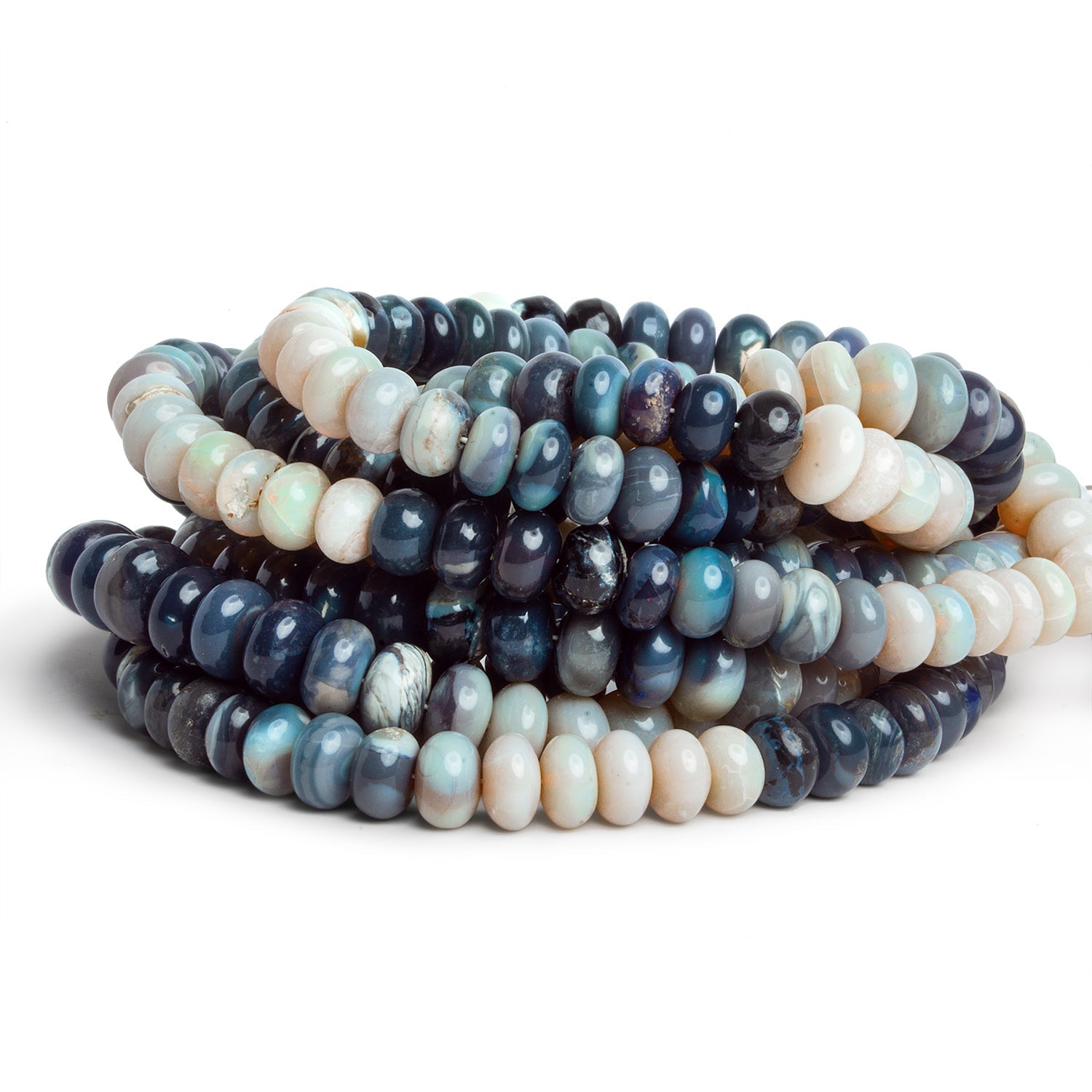 These natural Australian Opal rondelles feature a stunning mix of soft ivory, milky blue, slate grey, and storm-cloud indigo, each bead showing its own quiet play of color when turned in the light. The smooth, polished finish brings out the stone’s natural personality—some beads read like pale moonstone, others glow with hidden flashes of green, gold, or electric blue. Sized between 6–7mm, they offer a substantial presence without feeling bulky, perfect for bracelets, spacers in gemstone strands, or clean minimalist necklaces.