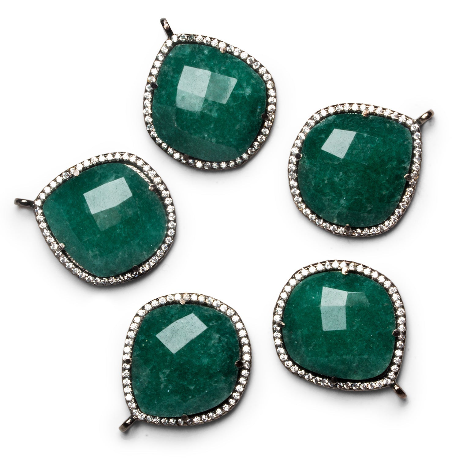 These striking fancy heart pendants feature richly saturated green aventurine, softly faceted to catch the light while showcasing the stone’s natural depth and subtle internal texture. Each heart is framed in a sleek black gold–finished bezel and surrounded by a delicate pavé halo of cubic zirconia, adding just the right amount of contrast and sparkle without overpowering the gemstone.