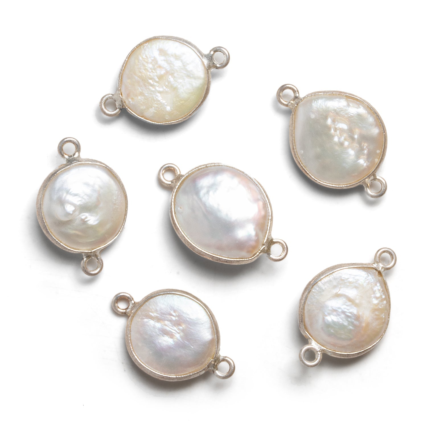 Pearls measure 12mm. These beautiful pieces show off a coin shape with a white color that brims myriad colorful overtones. Experience our exciting connectors at their best enveloped in our signature silver bezel. These pearl focal offerings are ideal for bringing together a necklace, earrings and a wide variety of Jewelry Designs.