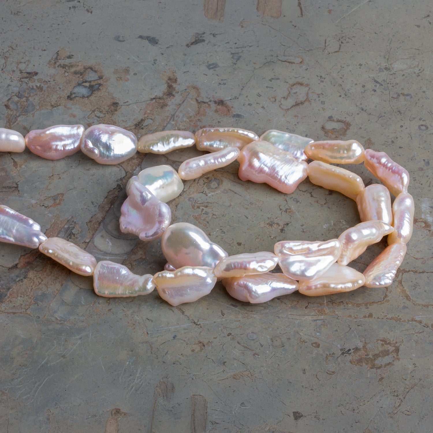Strung as a graduated mix, these pearls offer dramatic variation and movement, making them ideal for statement necklaces, asymmetrical designs, or focal-heavy compositions. Their soft pastel palette pairs beautifully with gold findings, silk cords, or contrasting darker gemstones, while the Biwa-style forms lend a distinctly artisanal, sculptural feel to finished jewelry.