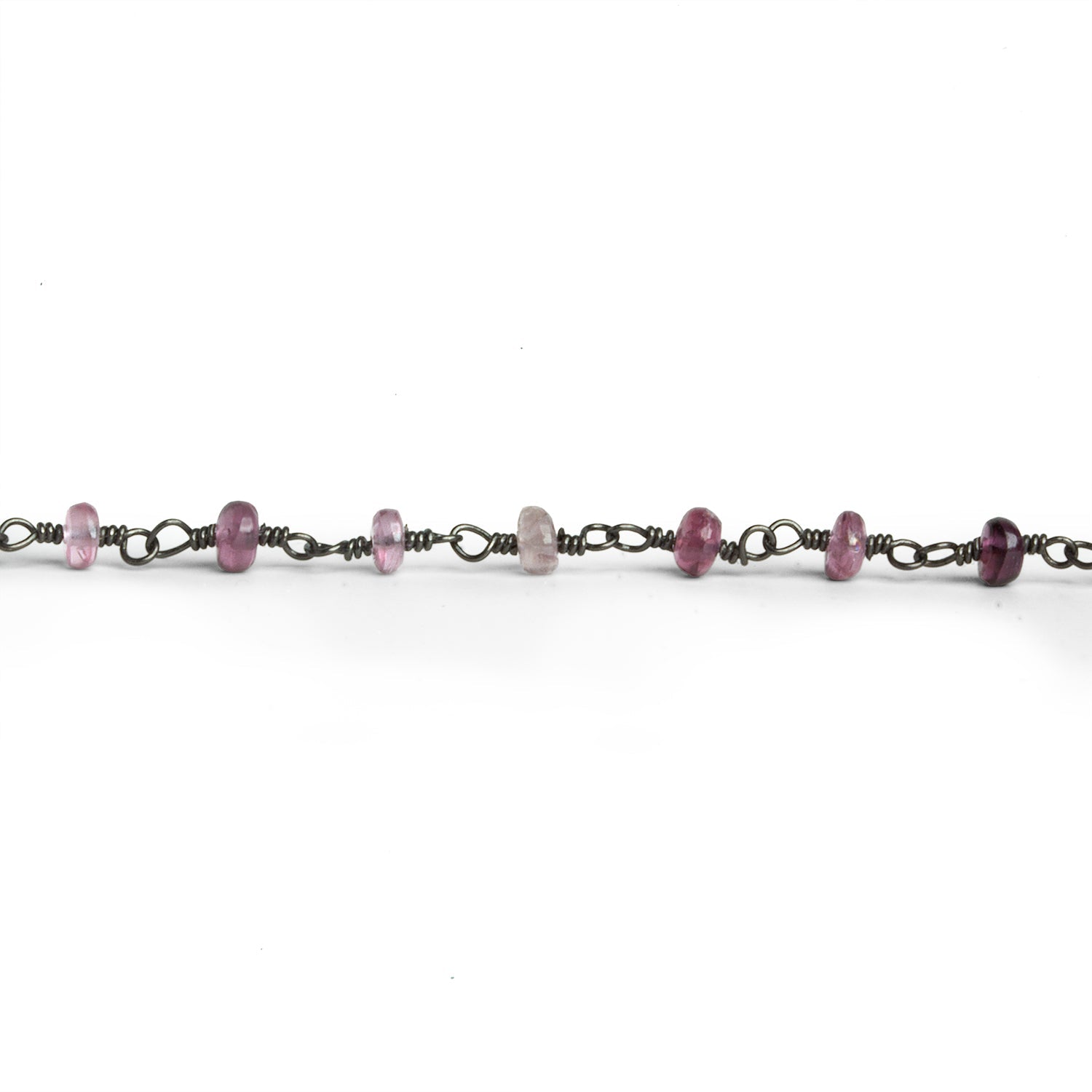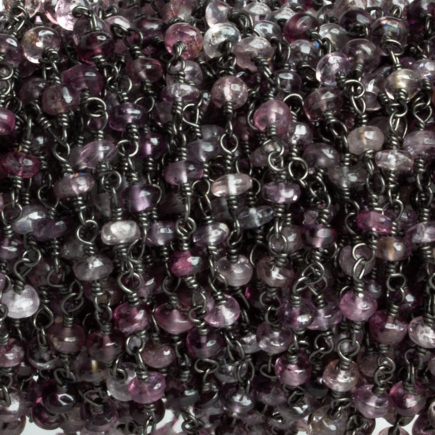 Elegant and versatile, this Mystic Spinel Rondelle Black Gold Chain brings together the allure of genuine spinel gemstones with the sleek edge of black gold-finished wire wrapping. Each rondelle measures approximately 3mm, showcasing subtle iridescence and deep plum-to-violet tones that give off a refined, luxurious shimmer. The hand-linked design ensures durability and flexibility, making it easy to incorporate into a wide range of jewelry styles.