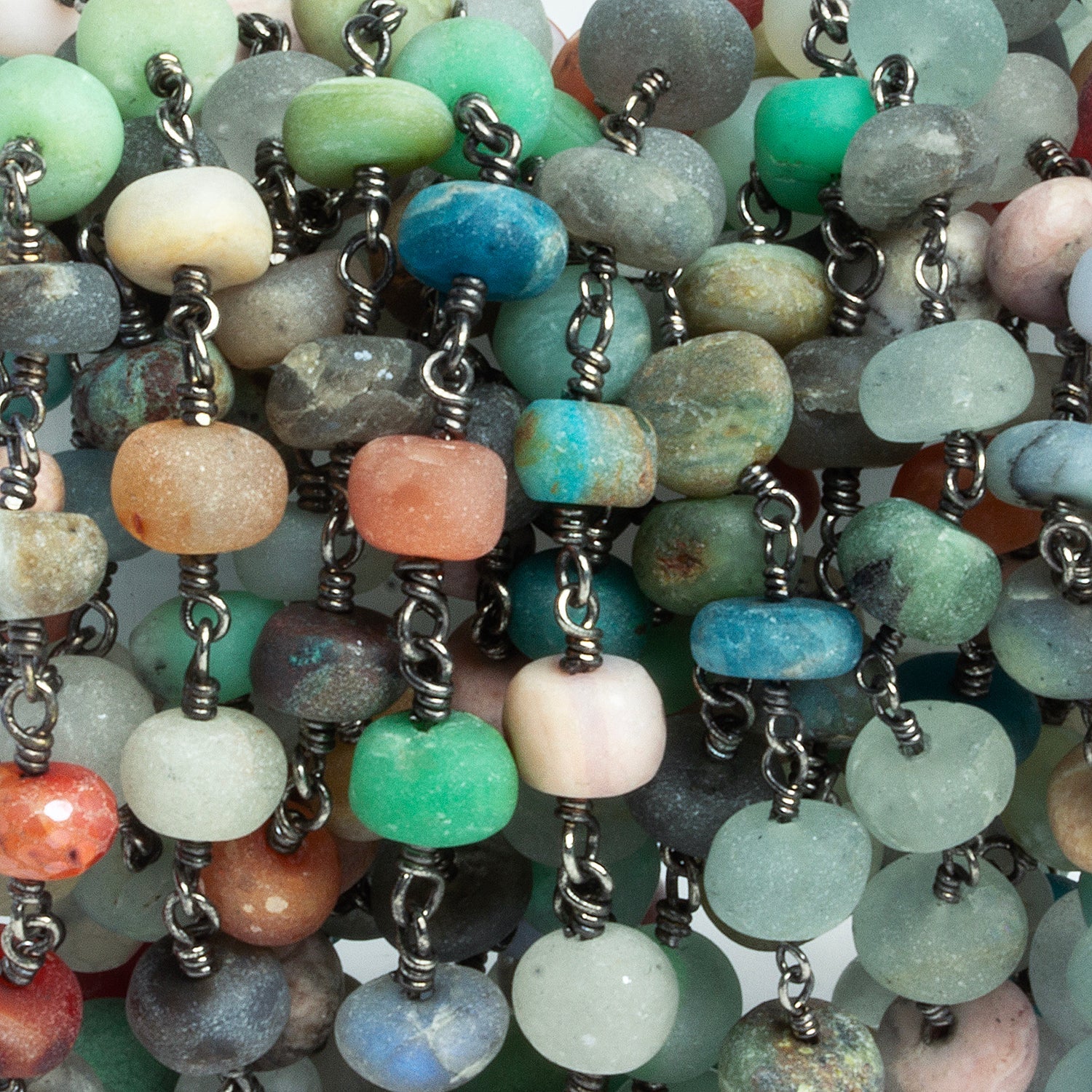 These Multi Gemstone Plain Rondelle Black Gold Chain strands feature 7mm beads in a stunning variety of natural gemstone colors and patterns, each linked by hand with dark-toned wire for a refined, artisan look. The matte and lightly polished finishes highlight the natural textures and inclusions, ranging from soft greens and turquoise blues to coral reds, earthy browns, and gentle creams. The uniform rondelle shape provides a balanced rhythm to the design, while the subtle variations in hue and tone give every inch of the chain a unique, organic appeal.