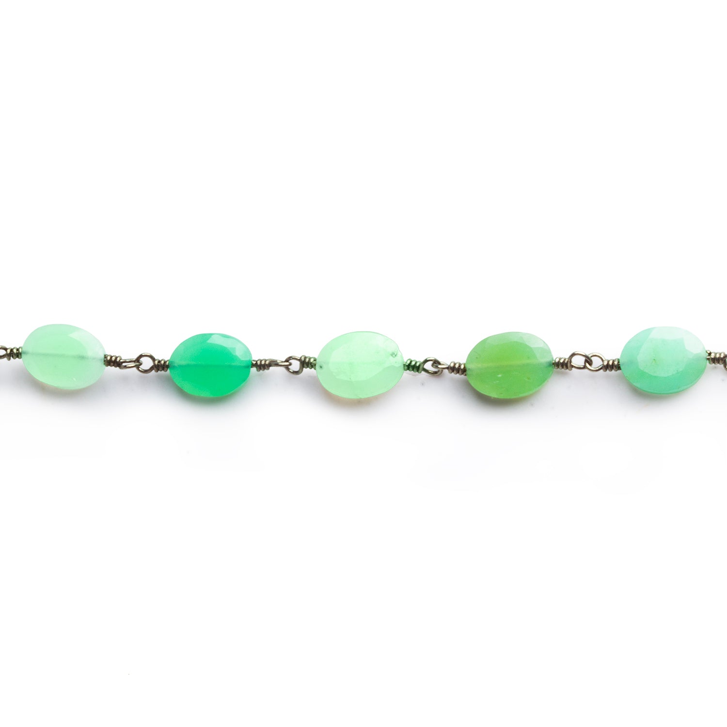 Our Chrysoprase Faceted Oval Black Gold Chain, averaging 8x6mm, showcases the vibrant green beauty of genuine Chrysoprase. Each bead is expertly faceted to enhance its luminous surface, displaying an array of green tones from minty pastels to rich, verdant hues. The subtle variations in color and clarity highlight the natural character of this gemstone, while the faceted cut brings an elegant sparkle to every movement.
