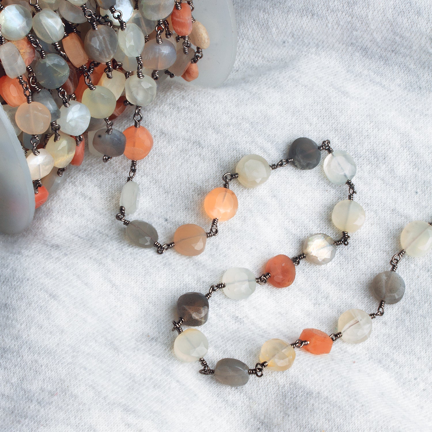 These 7mm Multicolor Moonstone Coin Chain links showcase a soft, ethereal palette that moves effortlessly from misty whites and silvery grays to warm peach and subtle champagne tones. Each coin-shaped moonstone is faceted to catch and scatter light, revealing gentle internal glow rather than harsh flash—perfect for designs that favor nuance and atmosphere over high contrast sparkle. The stones are individually wire-wrapped and linked with black gold–finished chain, creating a striking balance between luminous gemstone surfaces and dark, modern metal. The result is refined but organic, with just enough edge to elevate both minimalist and layered designs.