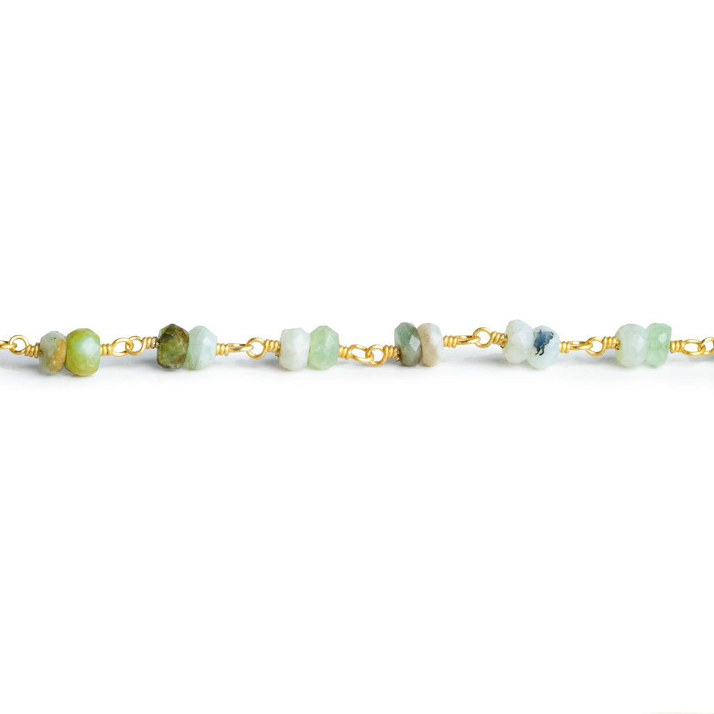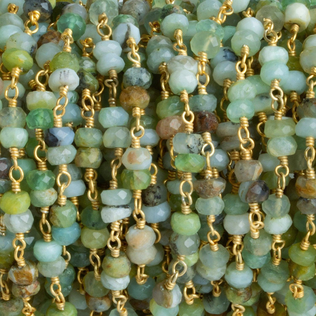 Beads average about 4mm to 5mm in diameter. This gorgeous handwrapped chain features a colorful melange of green-dominated Peruvian Opal tones that pair amazingly with our gold plated rosary chain. Includes about 56 beads per foot.