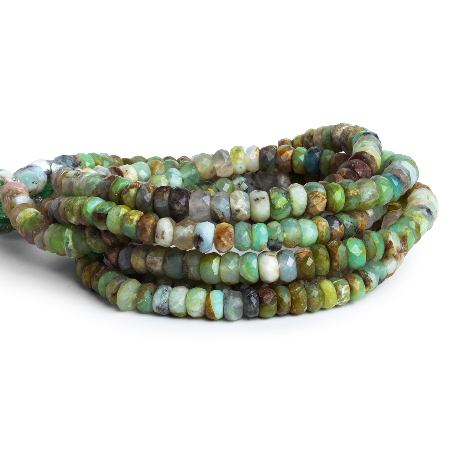 These Blue Peruvian Opal faceted rondelles showcase a beautifully organic mix of soft seafoam, pale aqua, mossy green, and earthy tan tones, with natural matrix and cloud-like translucency throughout. The subtle faceting adds gentle sparkle without overpowering the stone’s naturally soothing character, allowing the varied coloration and mineral inclusions to take center stage. Each bead is slightly unique, creating a strand with depth, movement, and a distinctly natural feel.
