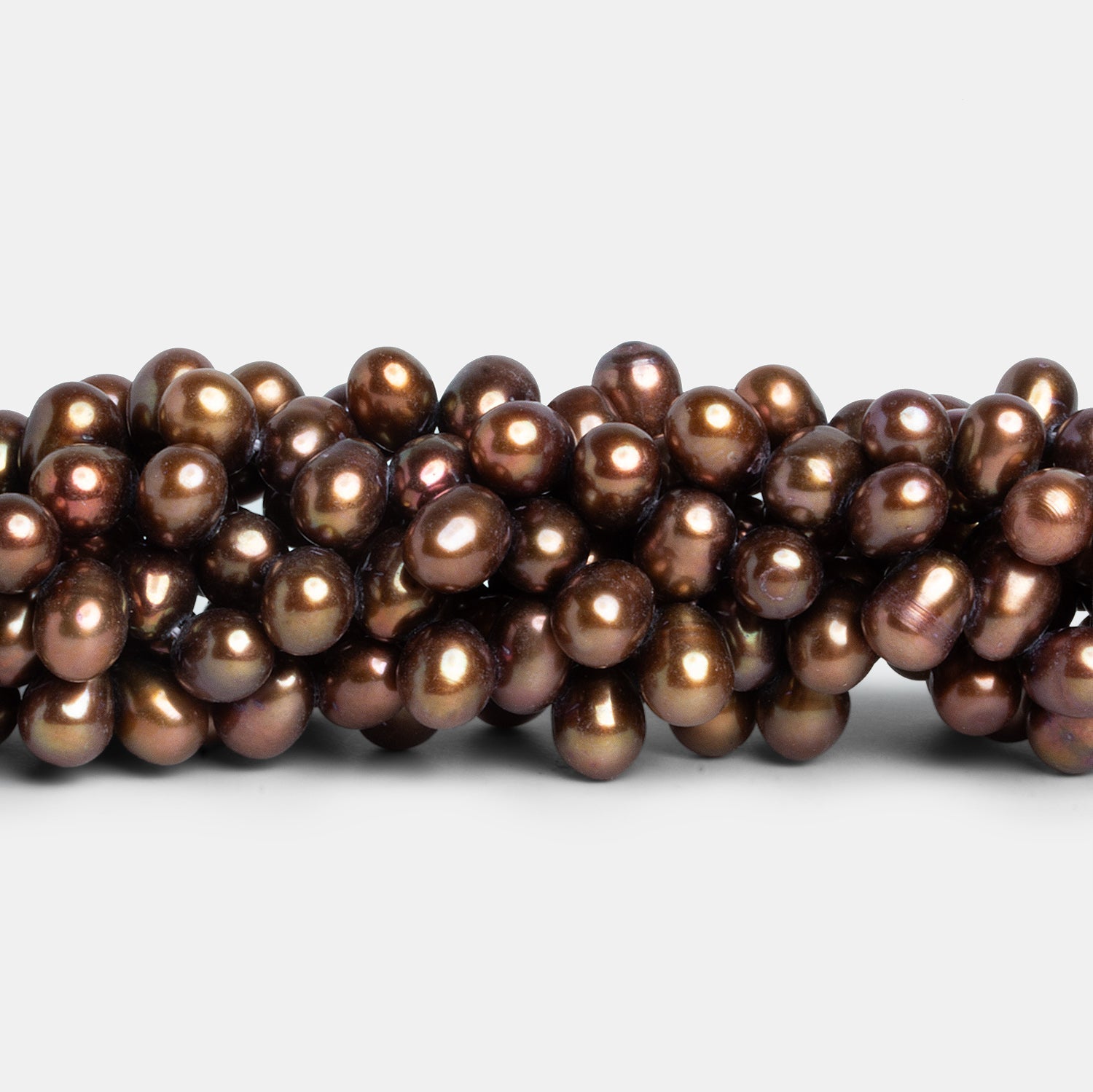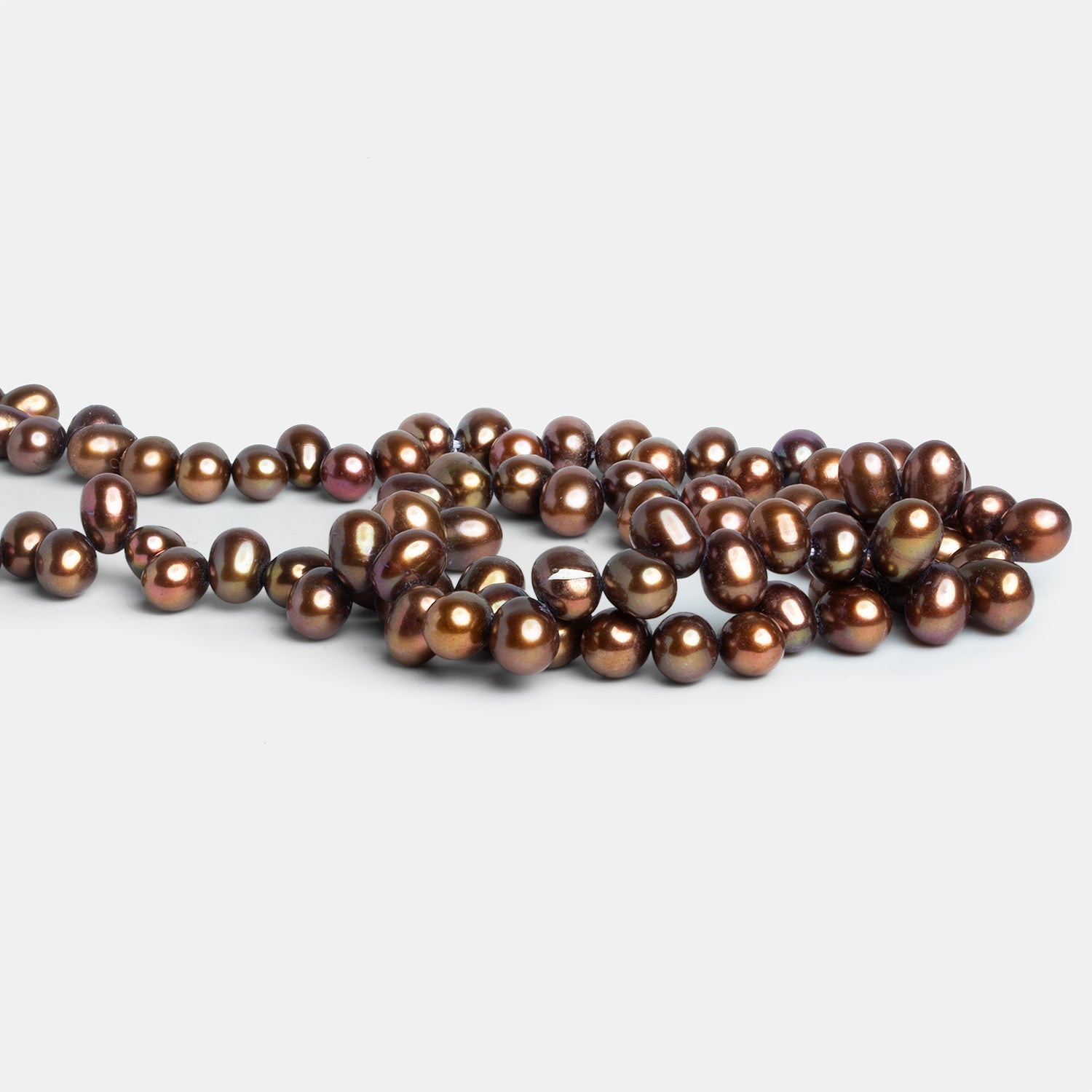 Beads measure about 10x6mm to 6x5mm. Top Drilled Oval Freshwater Pearls have a high luster with smooth nacre on the fairly symmetrical oval shaped bodies which match for strong copper brown hue and consistent grade on the strand of color treated top drilled freshwater pearls.