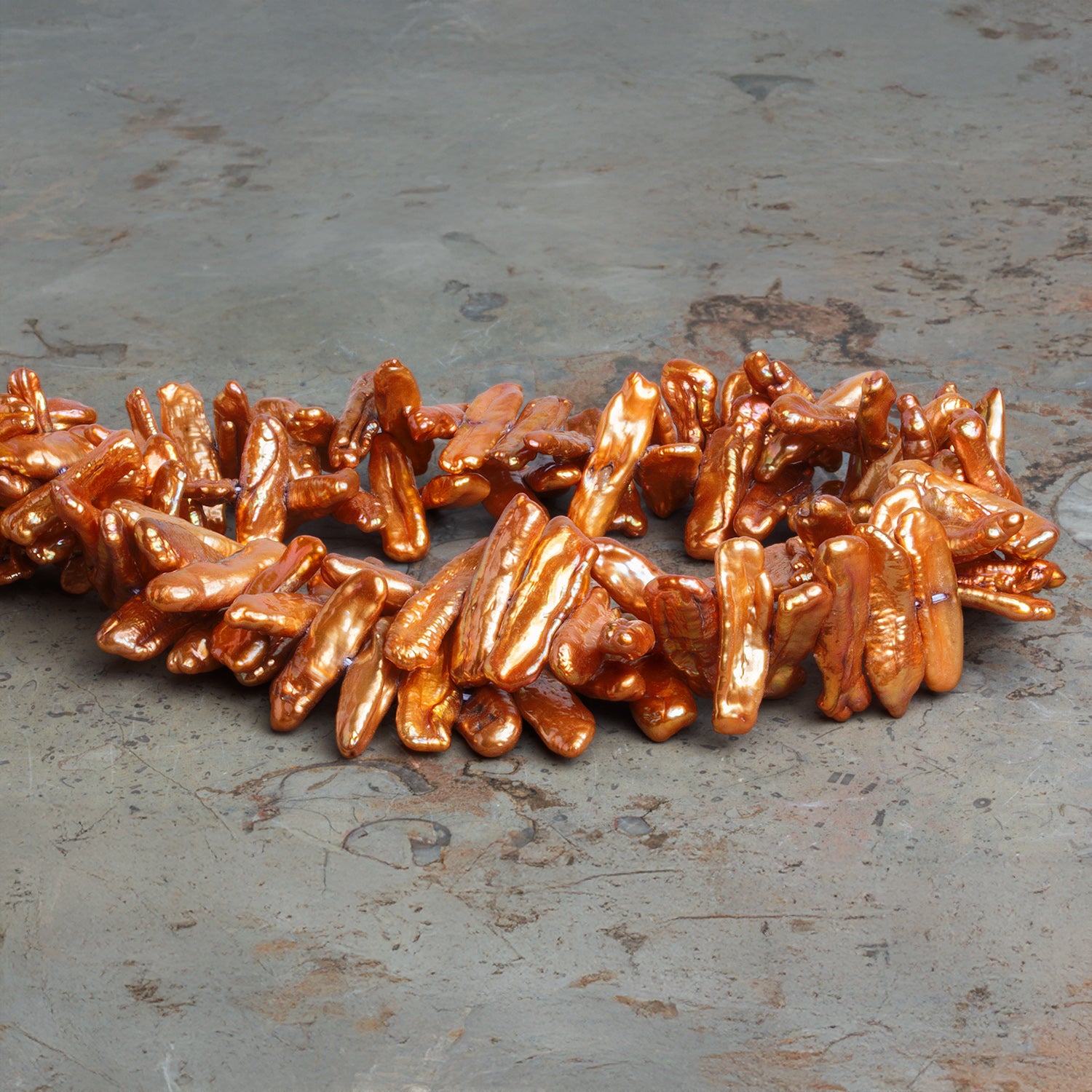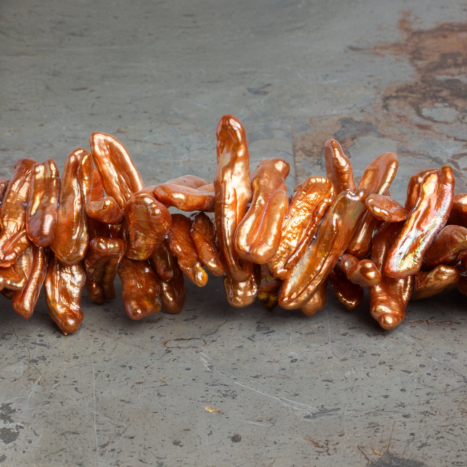 Carefully side-drilled for a dramatic vertical orientation, these pearls offer endless design possibilities—whether featured in statement necklaces, dangling earrings, or avant-garde bracelets. Their striking size and fiery iridescence make them ideal as focal pieces, while their unique shapes ensure that no two strands are alike. These Golden Copper Biwa pearls embody both natural artistry and bold sophistication, perfect for jewelry makers seeking a standout component with undeniable presence.
