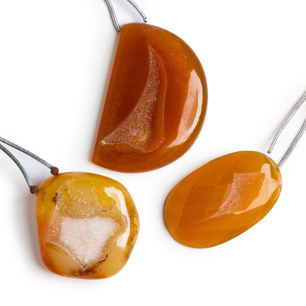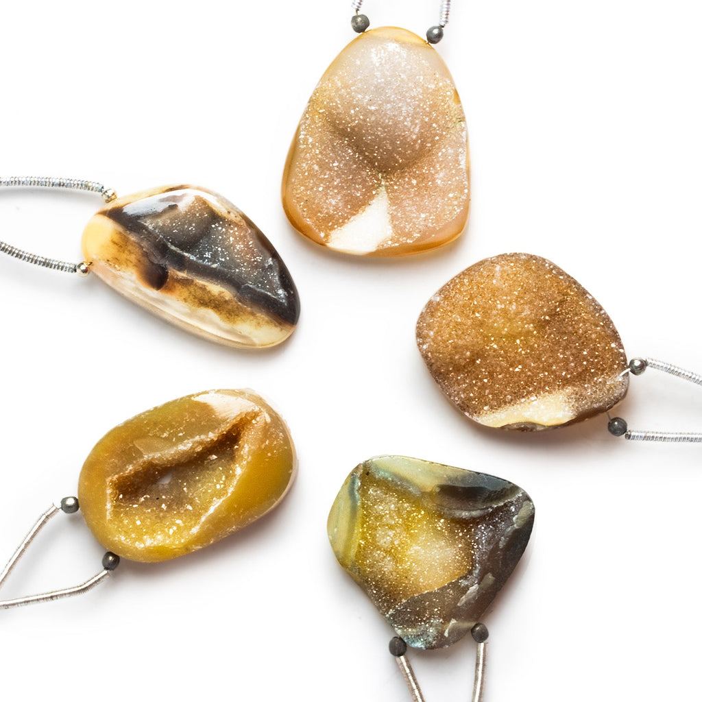 Agate drusy beads are known by a host of similar names and spellings, including druzy, drusie, druse, and druze, but no matter what they’re called they all concern small, shining crystals that catch the eye. This phenomenon, a result of geologic action over millennia, can occur within geodes (known more colorfully as thundereggs) or along vugs, which are gaps that can be found within rock.