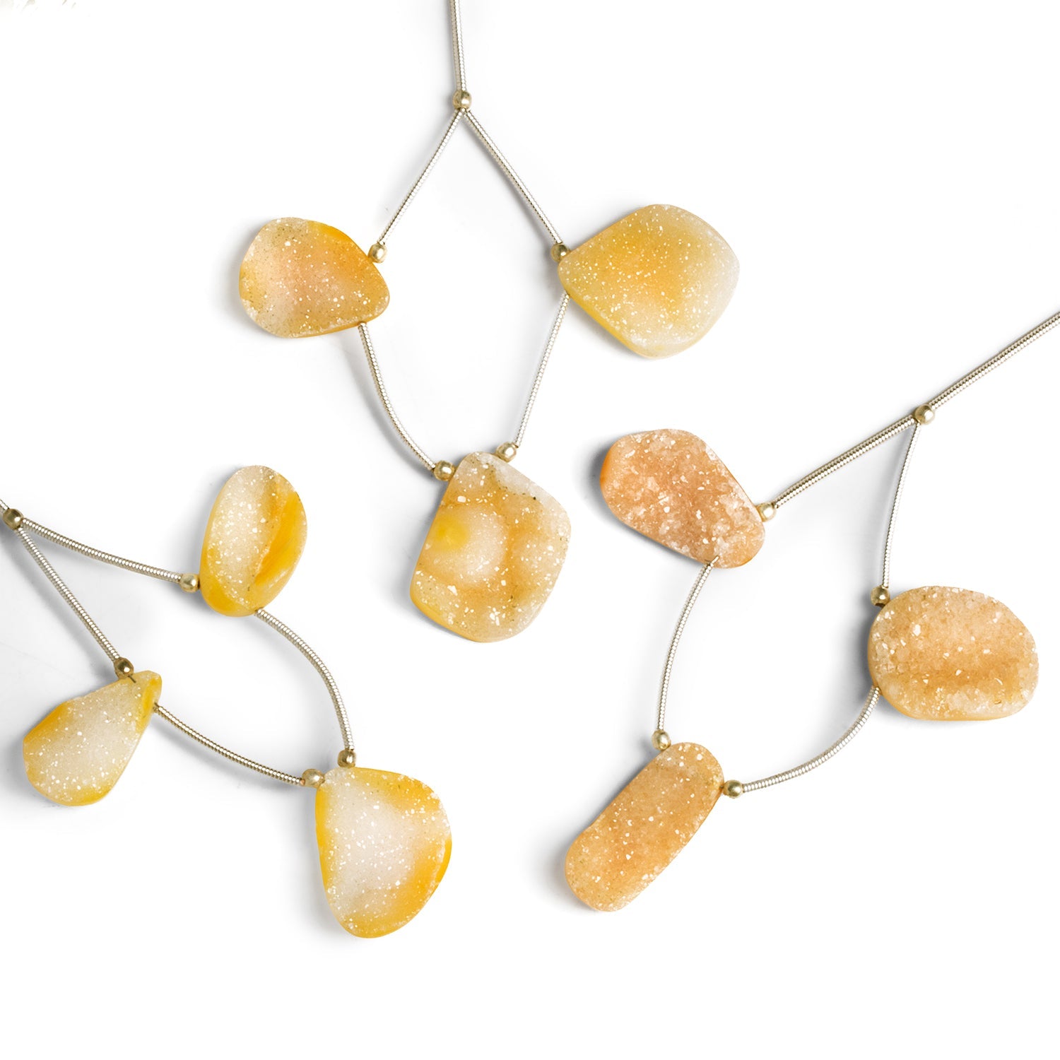 These Yellow Drusy Focal Beads feature a sunny, golden hue enhanced by the natural sparkle of their crystalline surfaces. Each bead boasts a unique organic shape and glistening texture, averaging approximately 23x16mm in size. Their warm tone is complemented by subtle variations of cream, honey, and amber within each piece, adding depth and character.