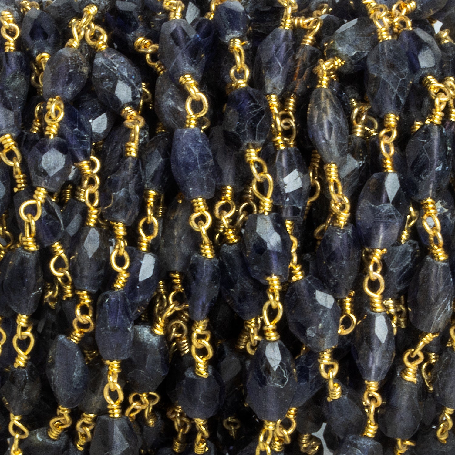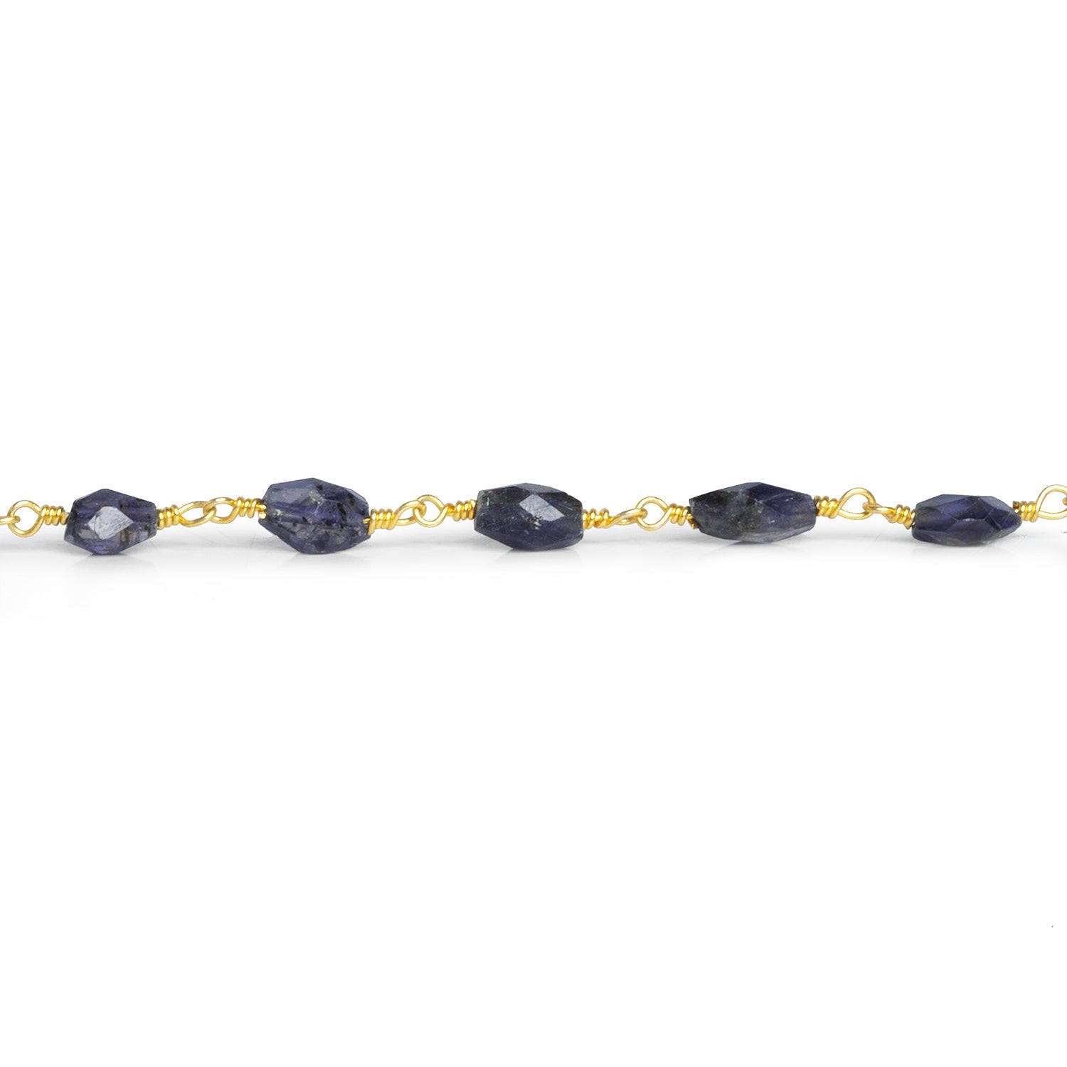 Beads average about 6.5x5mm with 33 beads per foot of chain. These dark and dreamy Iolite pieces have a rich purple color accented by its color change properties resulting in a tan or orange appearance from certain angles. This curated offering looks great in our signature gold plated handwrapped chain. Fans of Iolite should jump on this masterfully faceted chain design, perfect for elegant necklaces, earrings and more!