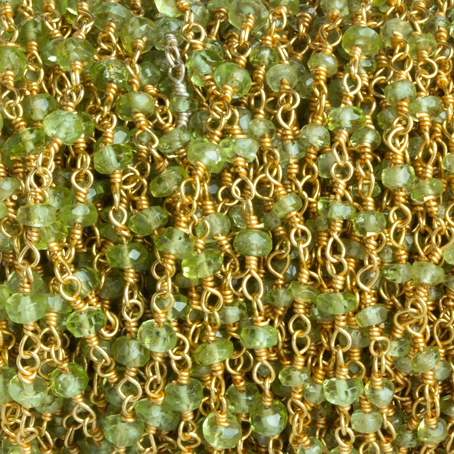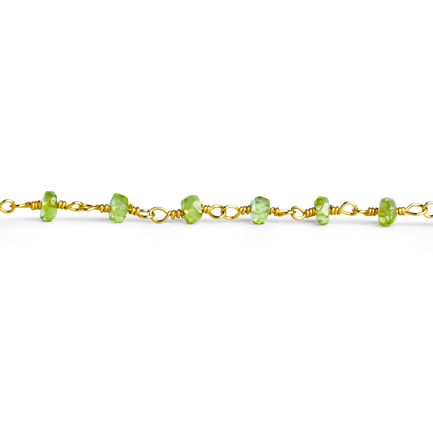 Our Peridot Faceted Rondelle Gold Chain features sparkling 3mm gemstones in a vivid spring-green hue, each precisely hand-cut to enhance their lively brilliance. These gemstones are linked with lustrous gold-plated wire, providing a warm complement to the crisp clarity and vibrant tones of peridot. The fine faceting catches and reflects light with every movement, adding a delicate shimmer that brings energy and freshness to your designs.