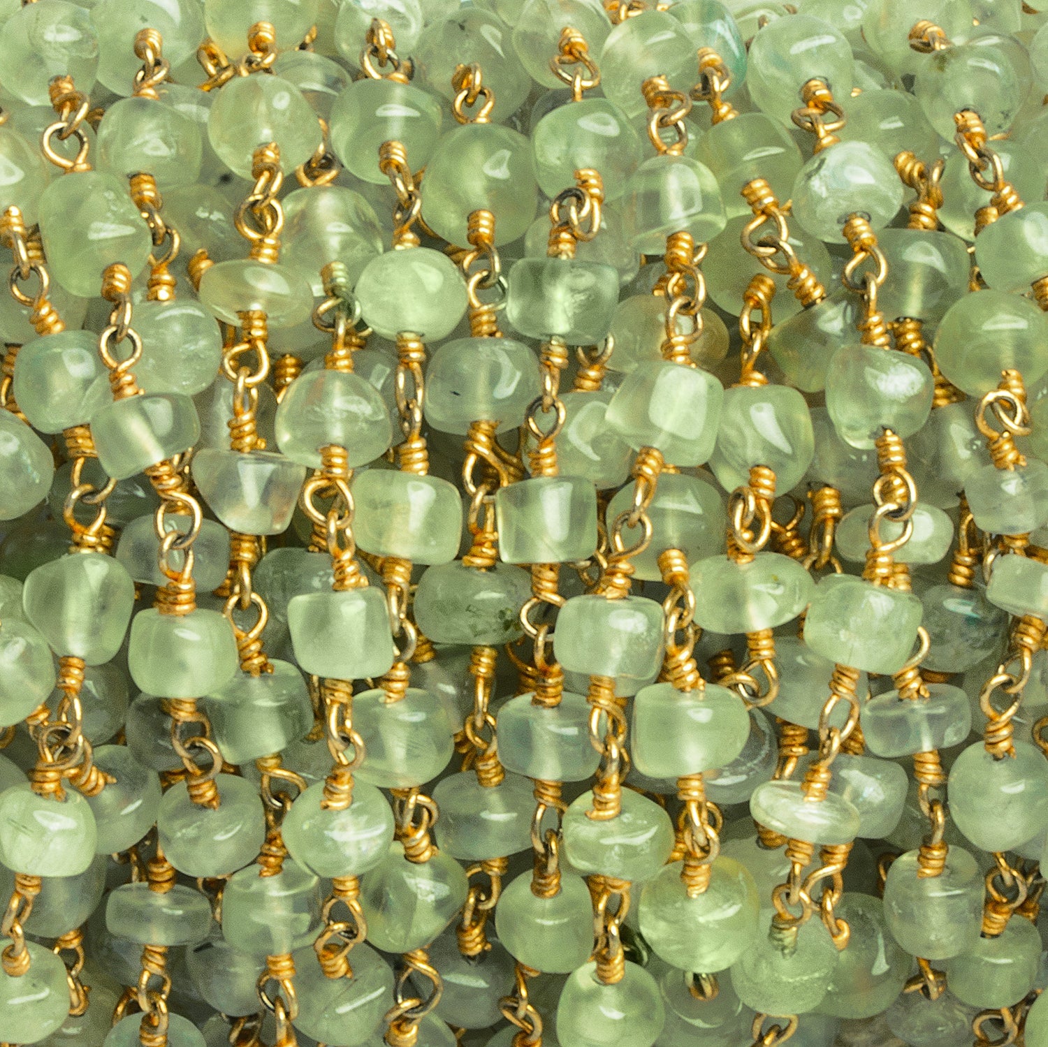 This Prehnite Plain Rondelle Gold Chain, featuring 4.5mm beads, radiates a fresh, luminous charm. The soft, translucent green of the natural prehnite offers a gentle, almost ethereal glow, with each smooth rondelle showcasing subtle internal inclusions that add depth and organic beauty. Hand-linked with warm gold wire, the chain provides a striking contrast, enhancing the serene green tones while adding a touch of refined elegance.