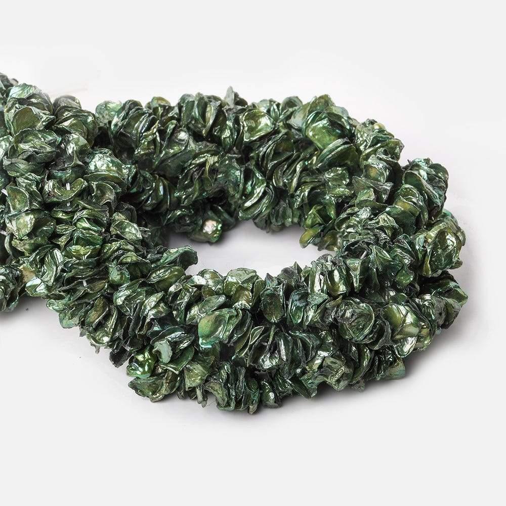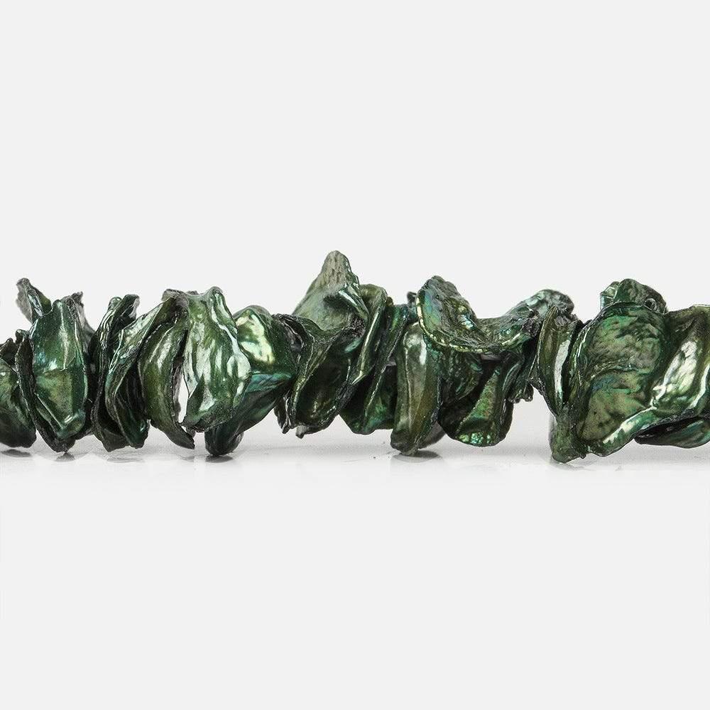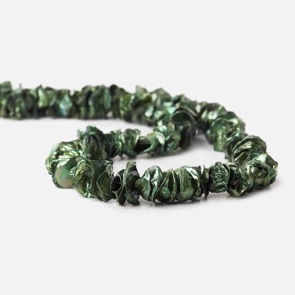 9-17mm Forest Green Center Drilled Keshi Freshwater Pearls have been center drilled for varied usage, have an cornflake-like Keshi shape, and these rich forest green pearls are varied on the strand for color showing beautiful quality, luster, and shape.
