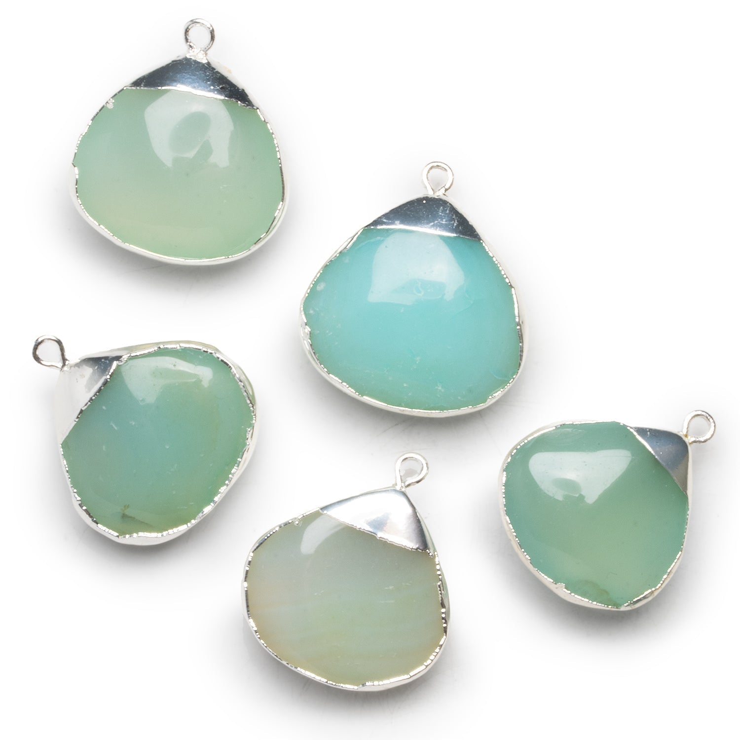 These Blue Chalcedony Silver Leafed Heart Pendants are striking with their unique design, measuring an average of 24mm. The pendants feature a soothing blue chalcedony, known for its soft, translucent appearance. The silver leafed accent at the top adds an elegant touch, contrasting beautifully with the cool hues of the chalcedony. These pendants, with their heart shape and subtle shine, are ideal for creating standout jewelry pieces that exude a serene and refined elegance. Perfect for necklaces, they will surely bring a touch of nature-inspired beauty to any design.