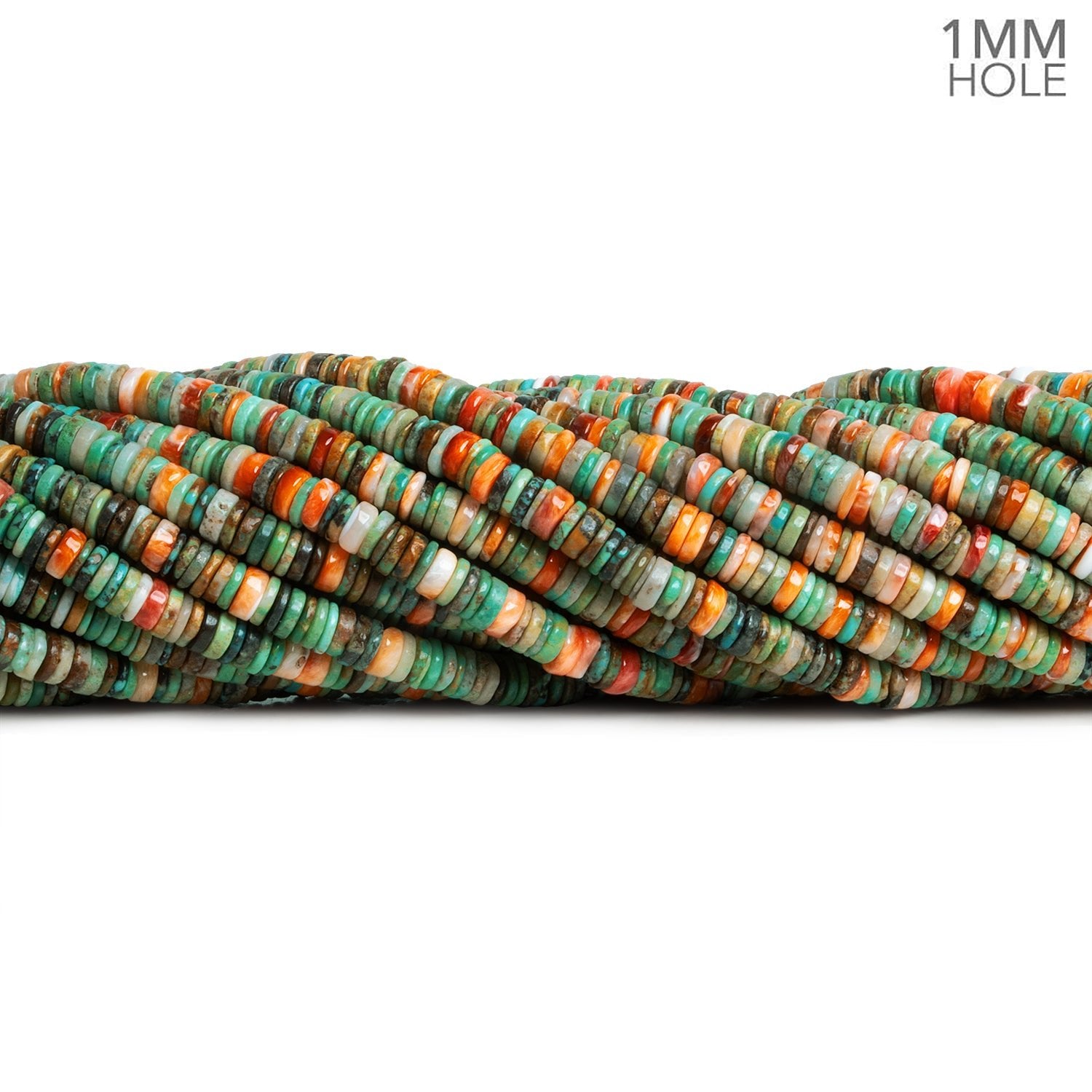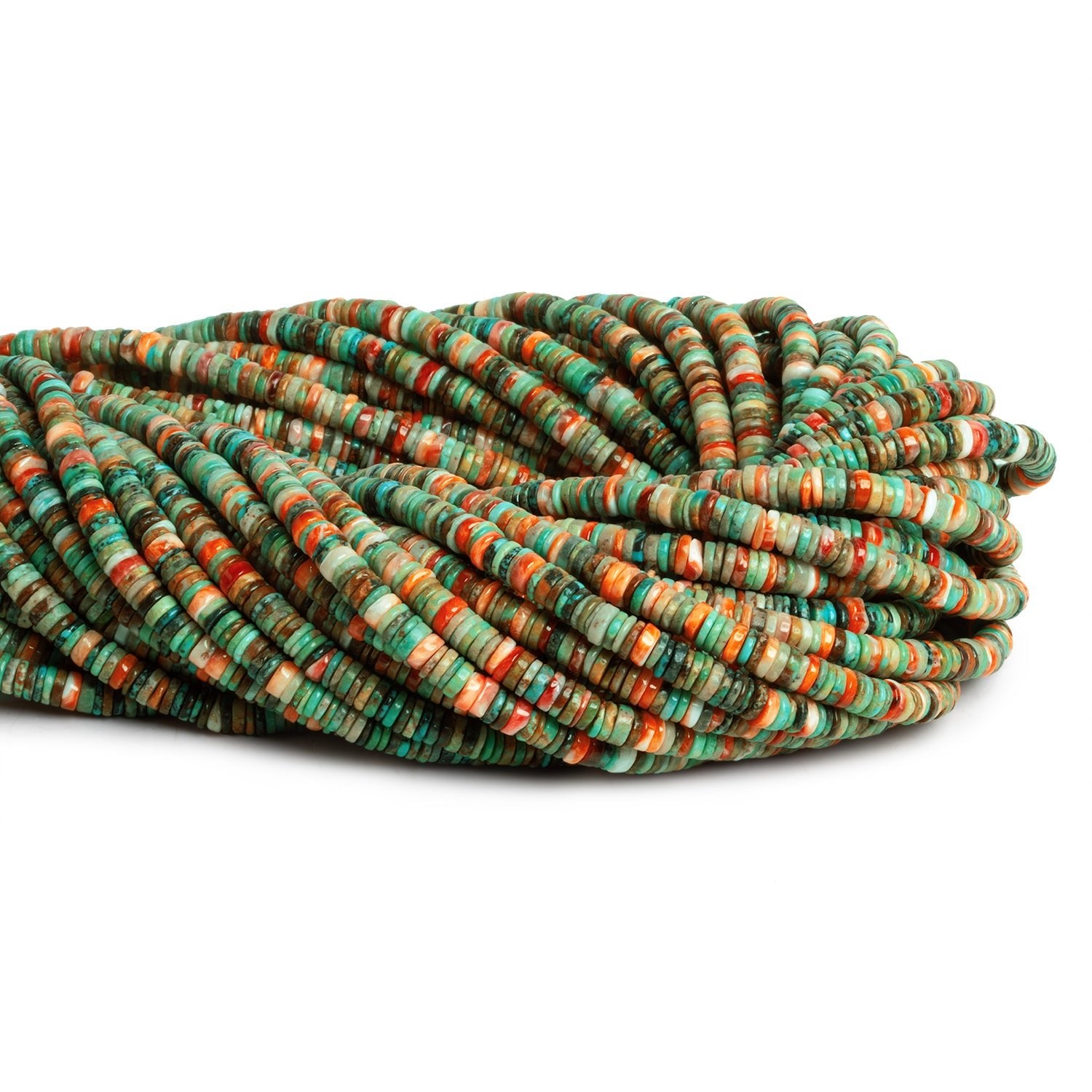 The smooth, polished surface of each heishi bead enhances its natural beauty, and the subtle shine from their polished finish allows the rich color and matrix of the stones to shine through. The unique color palette of these beads—fiery reds and oranges complemented by the cool, blue-greens of the turquoise—offers endless design possibilities, from boho-chic to southwestern-inspired pieces.