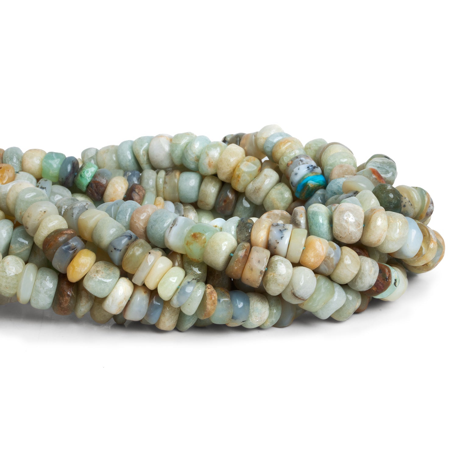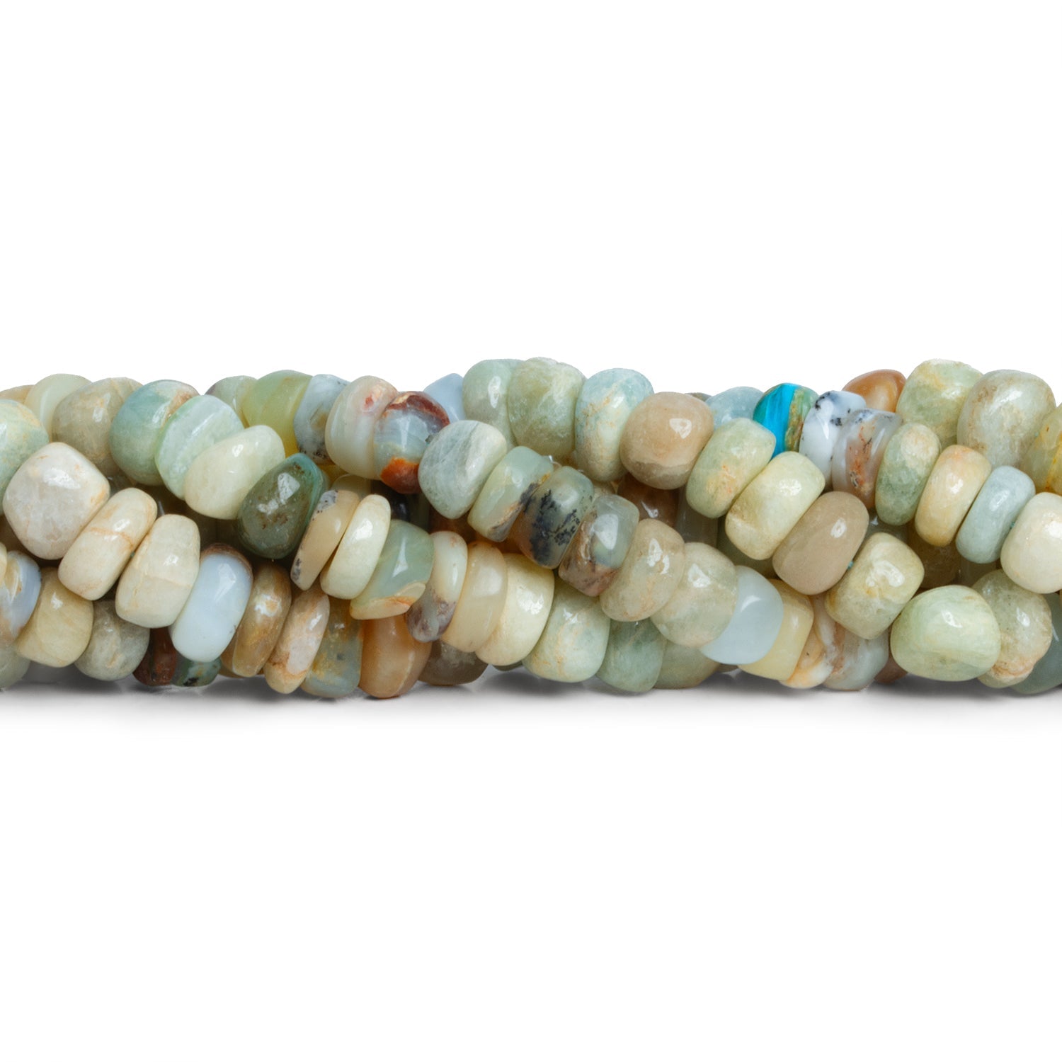 Beads average about 8mm in diameter with a couple of mm of variation possible due to the hand crafted style of design. Expect a relatively rounded shape for a heishi with variation in thickness to match the ranging color palette that encompasses familiar tones of Aquamarine with cream and rust toned matrix. These fine gemstone beads have been curated on the strand to include rich and subtly beachy tones. Our Aquamarine Handcut Heishis are perfect for Jewelry Designs in necklaces, bracelets, earrings and more.