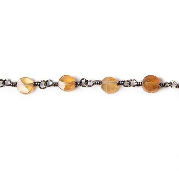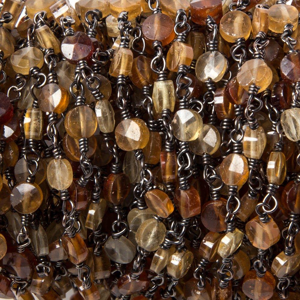 Approximates: 4mm diameter Hessonite Garnet faceted coin hand wire wrapped Black Gold plated Rosary Chain by the foot having 30 beads. Chain will be cut as continuous footage determined by quantity selected.