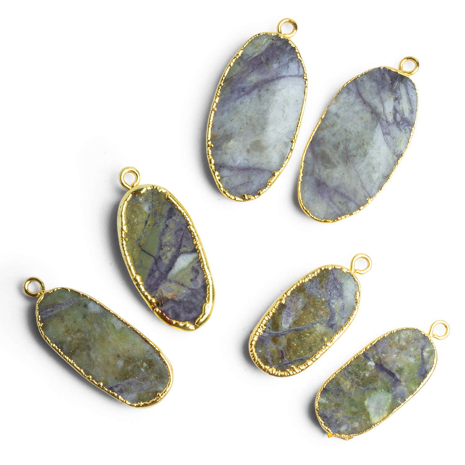 Each pendant is finished with a hand-applied gold leaf edge that follows the natural contours of the stone, adding warmth and contrast without overpowering the jasper’s earthy palette. Sized at approximately 30x12mm, these pendants are well suited for earrings, minimalist drops, or balanced focal accents in refined, nature-inspired designs. Sold as a matched set of two.