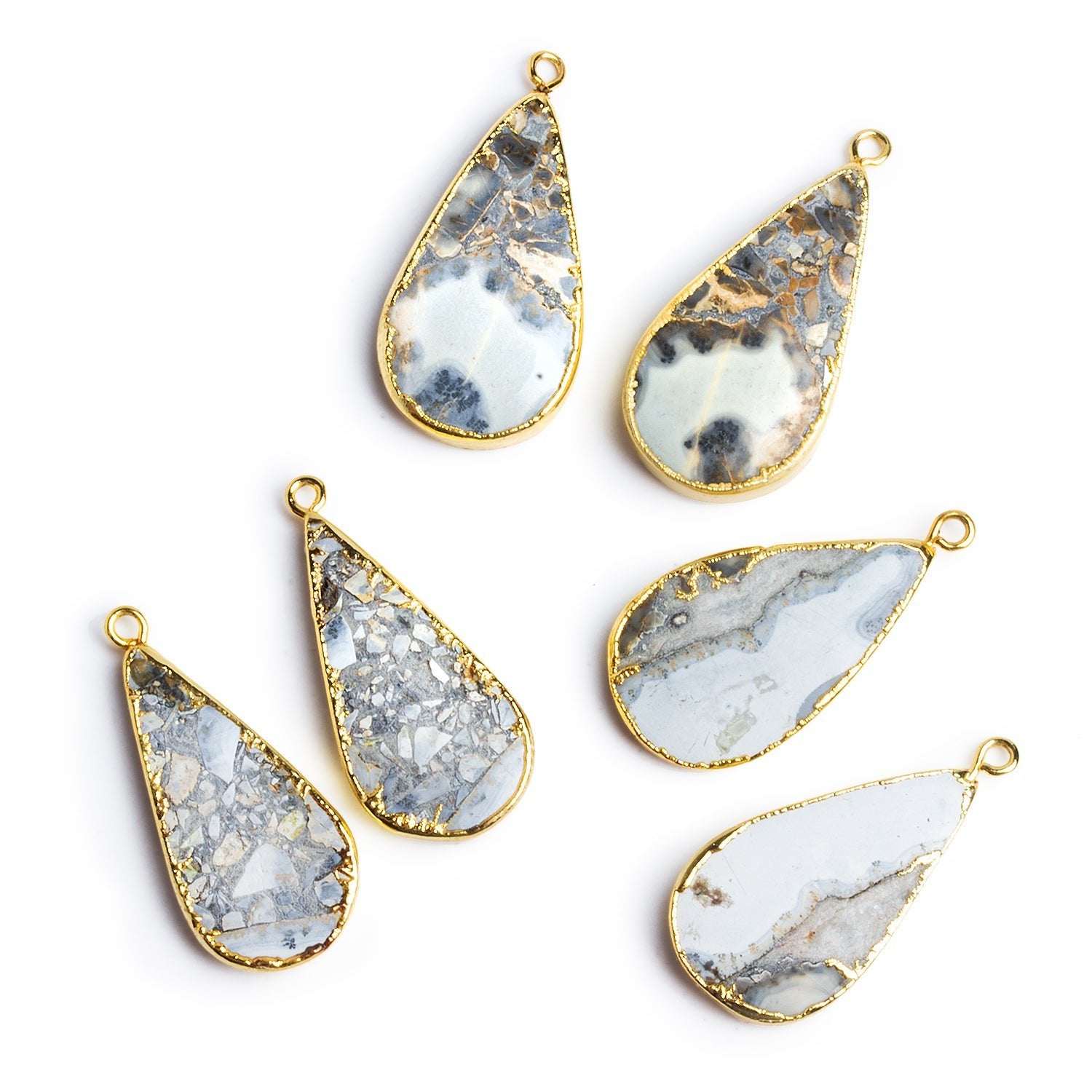 These elegant pear-shaped jasper pendants feature cool, airy tones of soft white, pale gray, and slate blue, accented by natural brecciated patterns and scattered mineral inclusions. Each stone shows unique marbling and mosaic-like fragments, giving them a crisp, stone-washed look with subtle contrast and depth. The surfaces are smoothly polished, allowing the natural patterning to stand out while catching light across the faceted contours.