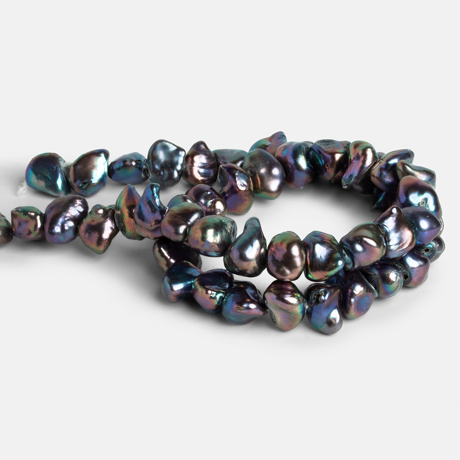 These Peacock Keshi Freshwater Pearls radiate a mesmerizing luster with their rich, iridescent hues of deep violet, teal, peacock green, and midnight blue. Each pearl is uniquely baroque in form, showcasing the natural, organic beauty that Keshi pearls are prized for. Their captivating sheen shifts with the light, creating a surface play of color that makes every strand entirely one-of-a-kind.