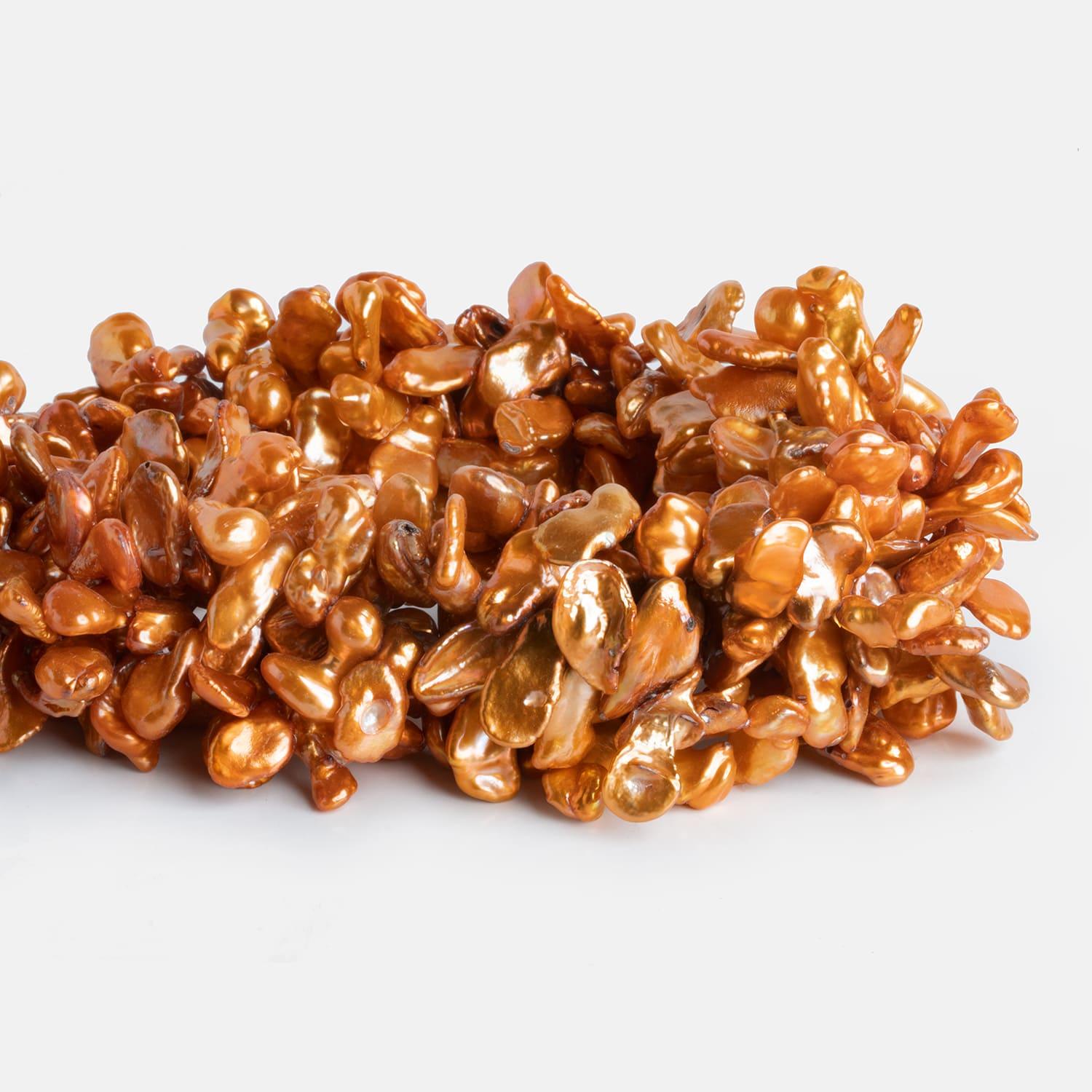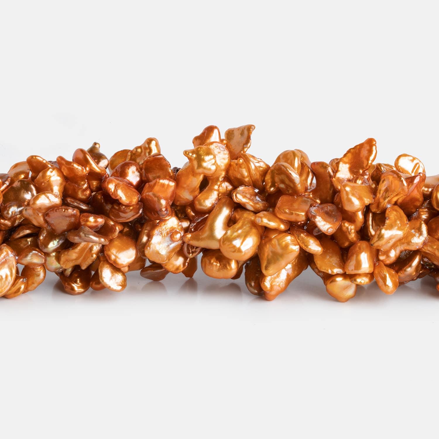 Pearls measure about 10x8mm to 20x10mm. These exquisite pearls have a lovely charm showing off a rich golden orange color palette that is highly consistent.