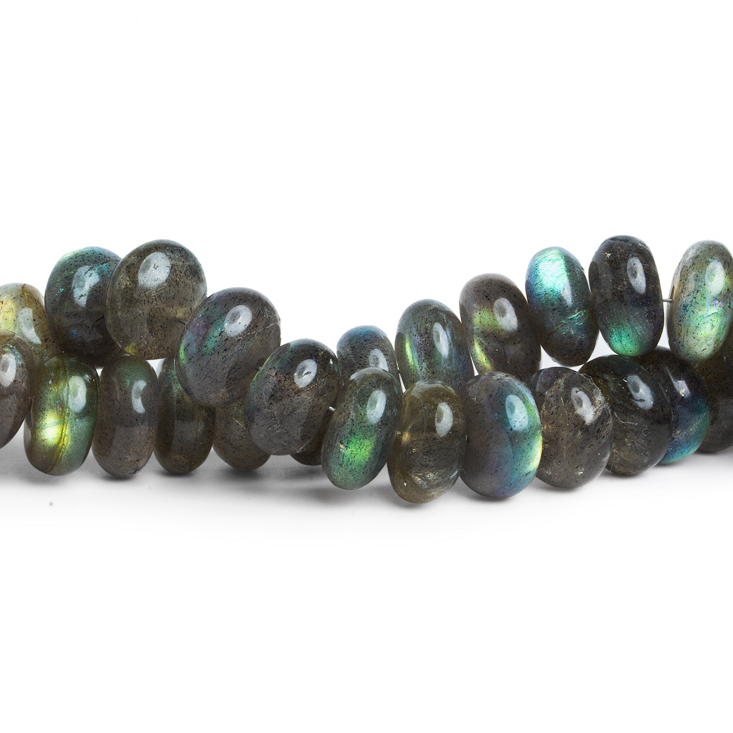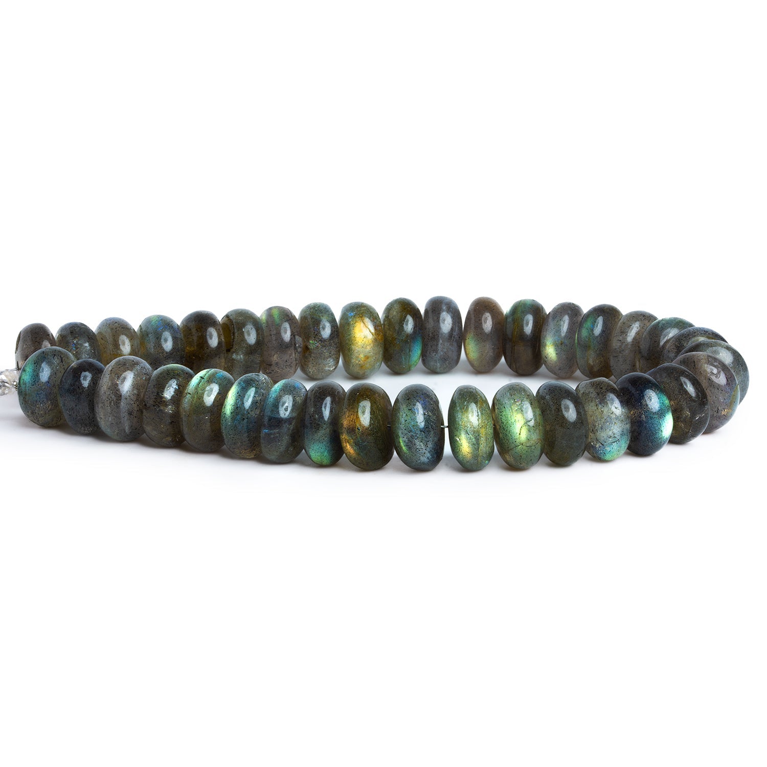 These 10mm Labradorite Plain Rondelle Beads shimmer with the gemstone’s signature play of color, known as labradorescence. Each bead reveals flashes of blue, green, and gold against a smoky gray body, catching the light with a luminous glow that shifts as they move. Their smooth rondelle cut highlights the natural sheen of the stone, creating an elegant balance between polish and organic character.