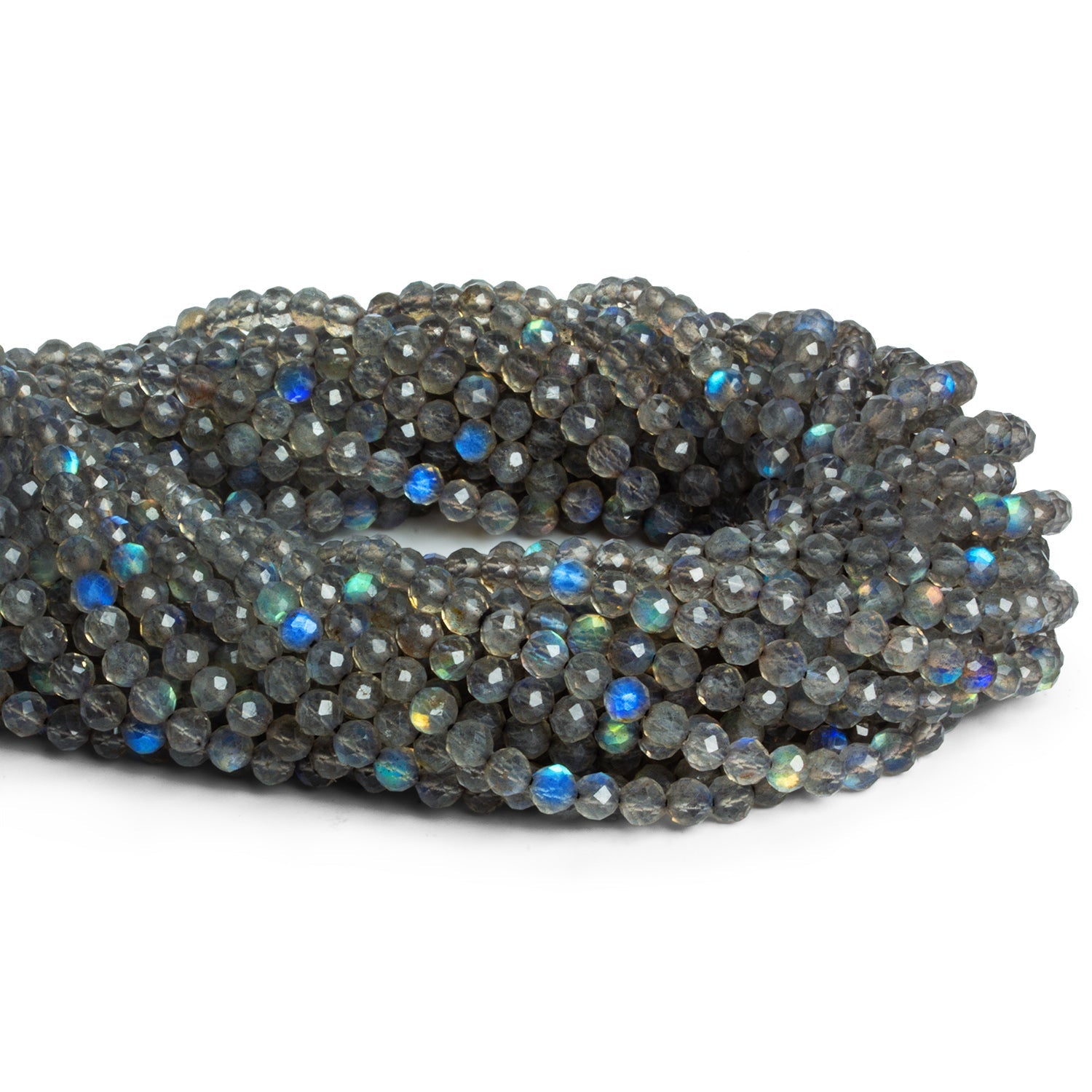 Discover the luminous beauty of our 4mm Labradorite Microfaceted Rounds, meticulously cut to reveal brilliant flashes of blue, green, and gold throughout each strand. These AAA-grade beads feature consistent 4mm sizing, crisp microfaceting, and a saturated grey base tone that enhances the signature labradorescent shimmer. Each 12-inch strand includes approximately 74 beads, offering an ideal balance of sparkle and subtlety for both minimal and complex designs.