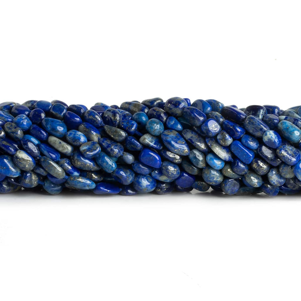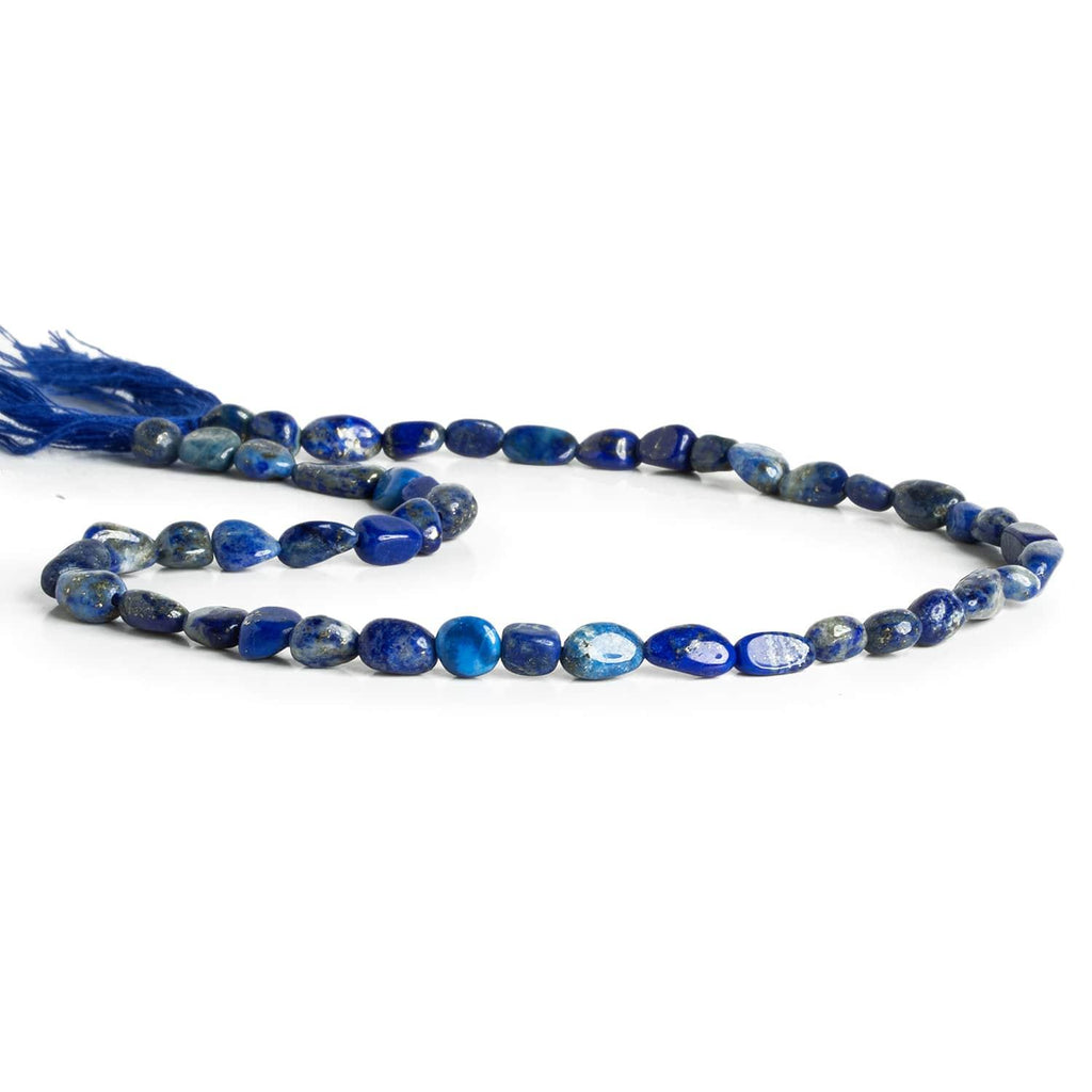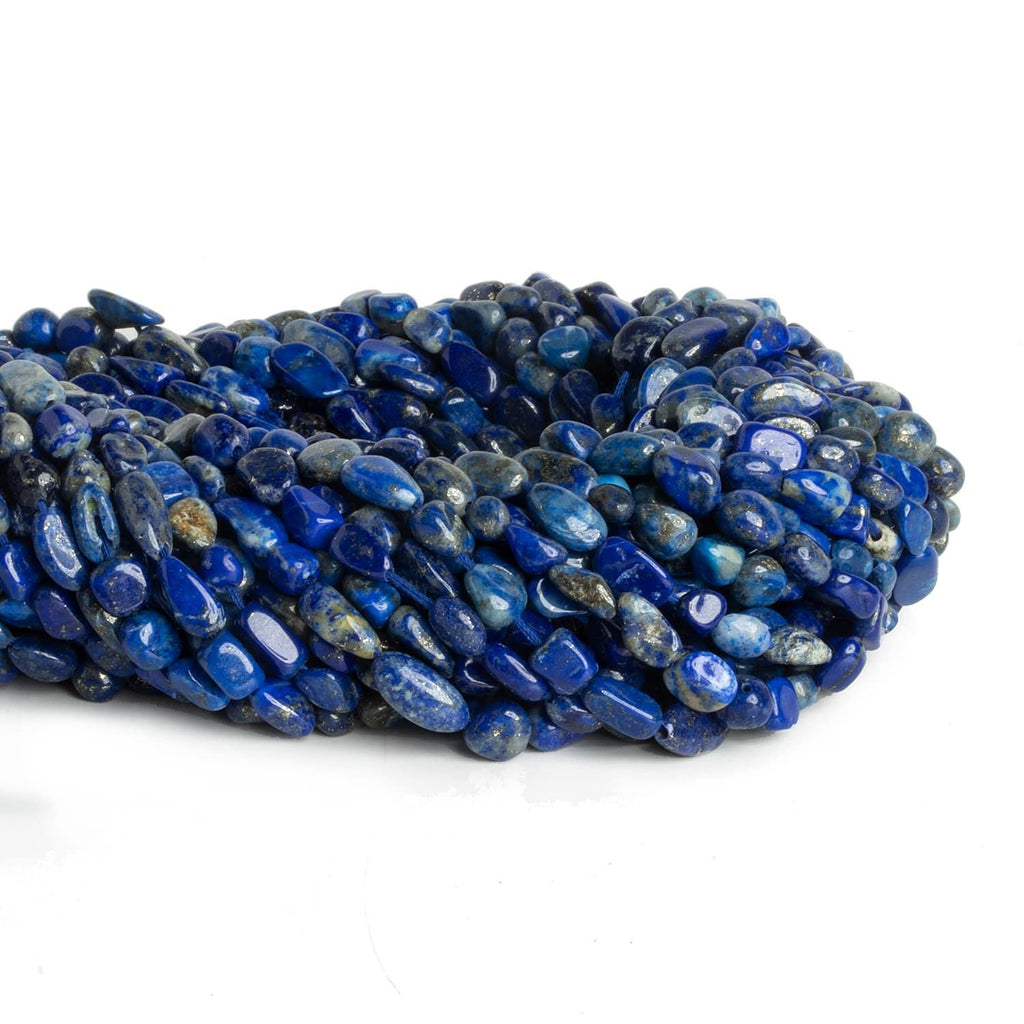 Beads range from about 5x4mm to 10x5mm. These nuggets have a smooth polish across opaque bead bodies. Expect a traditional Lapis Lazuli blue color palette with speckles of pyrite. The style of small, plain nugget sees significant variation in size and shape on each strand.