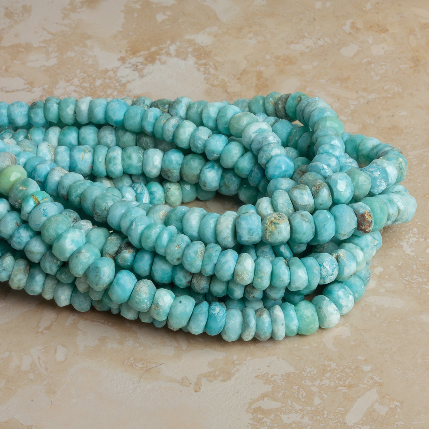 Sourced from the Dominican Republic, Larimar is a rare variety of pectolite found in only one place in the world. These rondelles are well suited for fluid necklaces, bracelets, or spacer-heavy designs where consistent color and a relaxed, natural look are key. Their approachable size and soft polish make them especially easy to pair with silver, gold, or other coastal-toned gemstones.