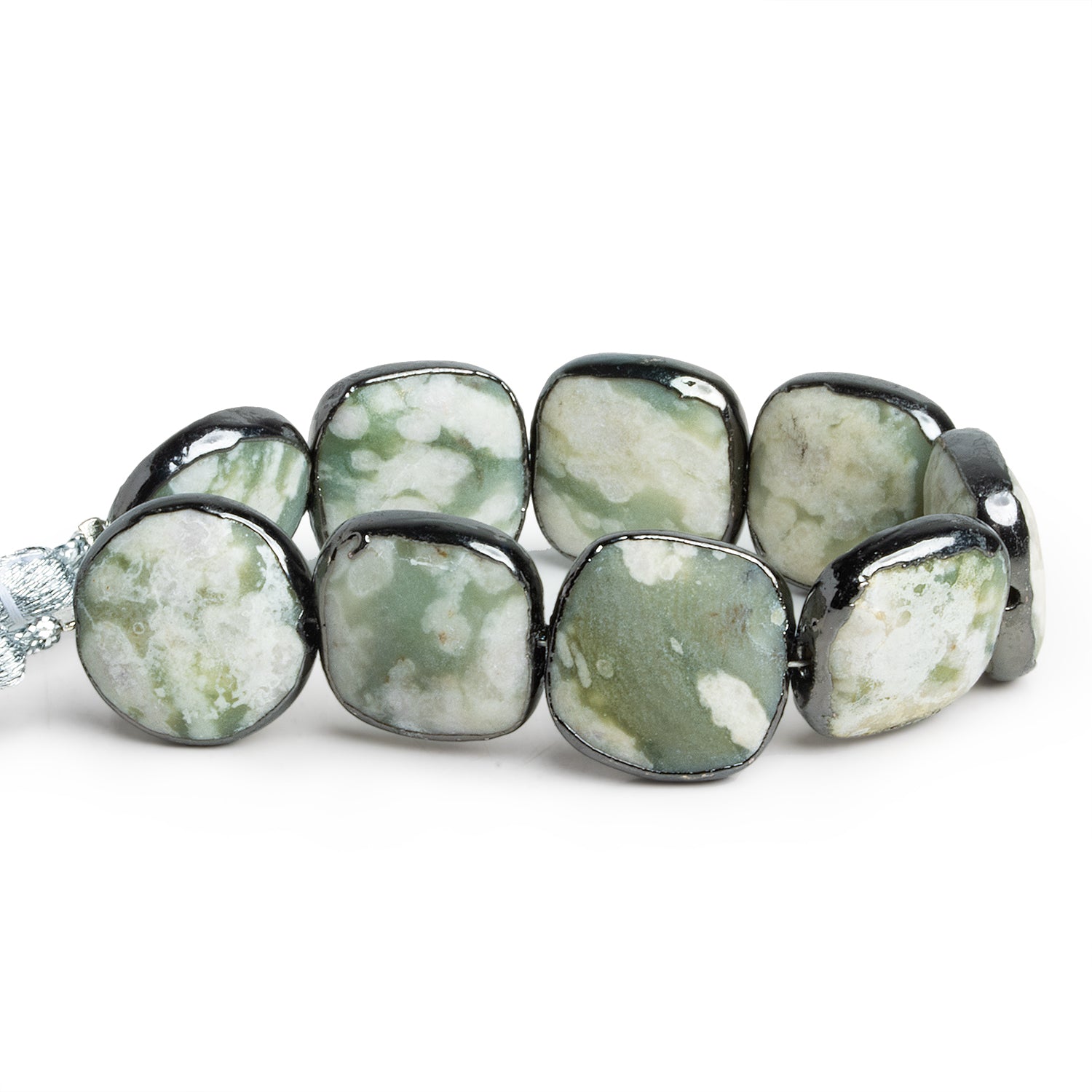These Black Gold Leafed Jasper Squares offer a striking contrast of earthy greens and neutrals combined with sleek, metallic black gold leaf edges. The natural jasper stones display subtle marbling patterns, with each bead measuring 15mm in diameter, providing a bold presence for your jewelry designs. The black gold leaf accents add a sophisticated touch, enhancing the stones' organic beauty and giving them a refined, modern feel.