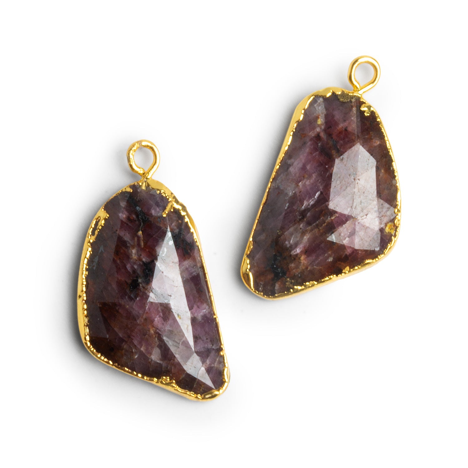 This matched pair of gold leafed sapphire pendants features rich plum and wine-toned hues with soft flashes of mauve and rose shimmering across the faceted surfaces. The natural color zoning and scattered mineral inclusions create beautiful depth and movement within each stone, giving them a moody, jewel-toned look that feels both earthy and refined. Each sapphire is framed in a hand-applied gold leaf edge, highlighting the organic outline and enhancing the warm undertones of the stones.