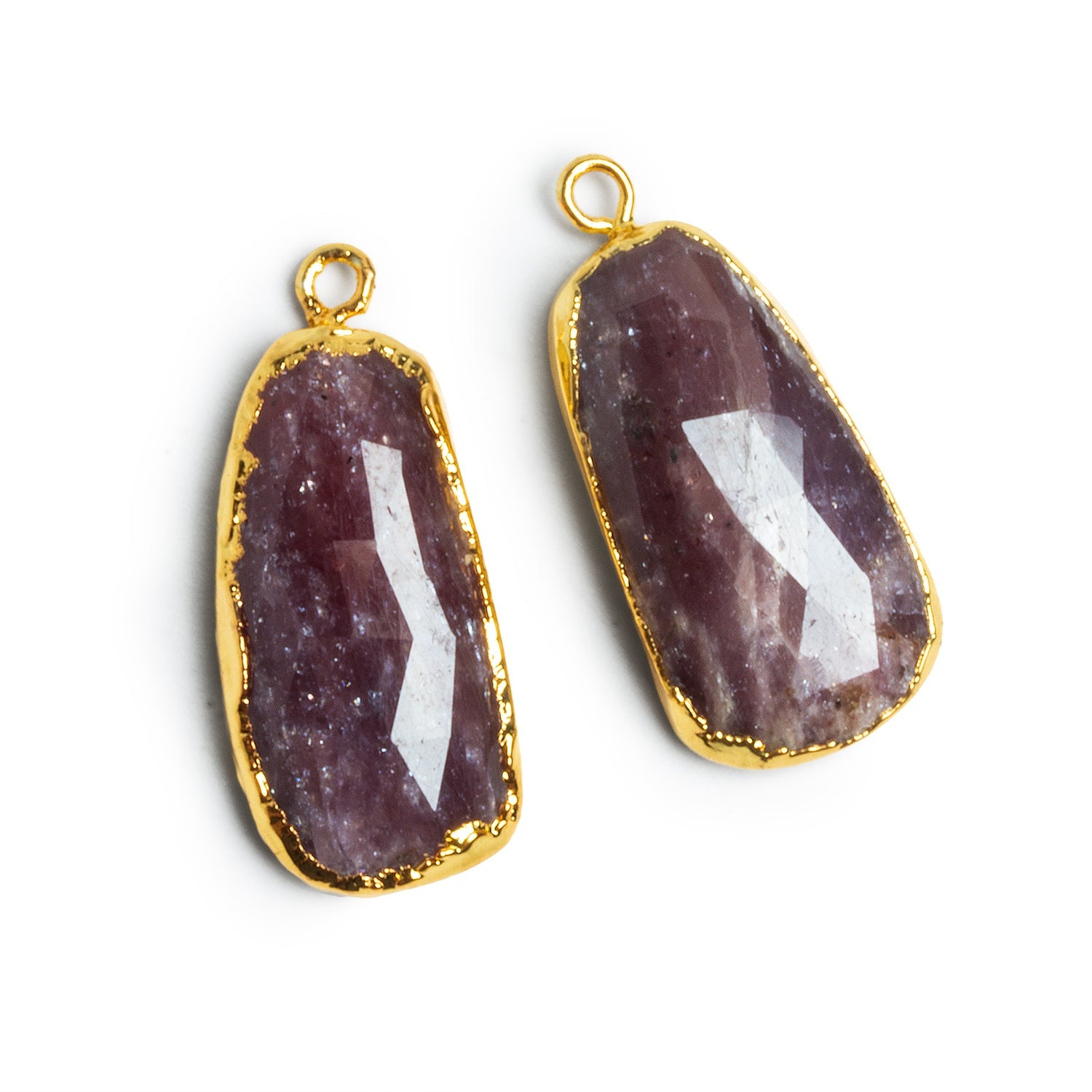 These elongated sapphire pendants display beautiful natural shades of mauve, blush pink, and soft plum, with gentle tonal variation created by the stone’s internal crystal structure. The faceted surfaces give off a smooth, glassy shimmer rather than sharp brilliance, allowing the subtle color shifts to move across each pendant as they catch the light. Each sapphire is organically shaped and finished with a rich gold leafed edge that highlights the stone’s natural contours while adding warm contrast to the rosy palette.