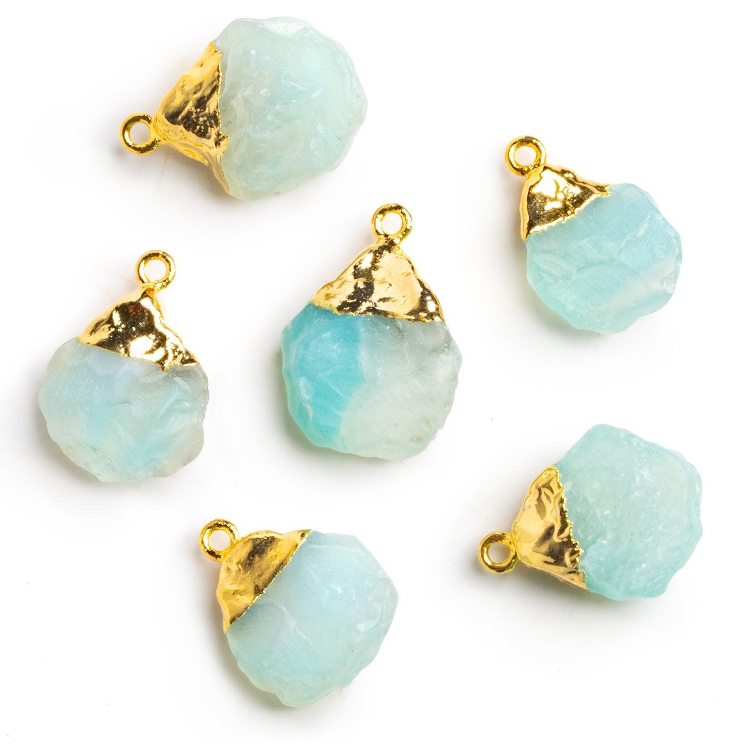 Beads average about 24x16mm with a few mm of variation due to irregularity inherent to the hammer faceted shape. These light blue beauties bring a fascinating organic look to a focal bead that catches the eye paired with our signature gold leaf.