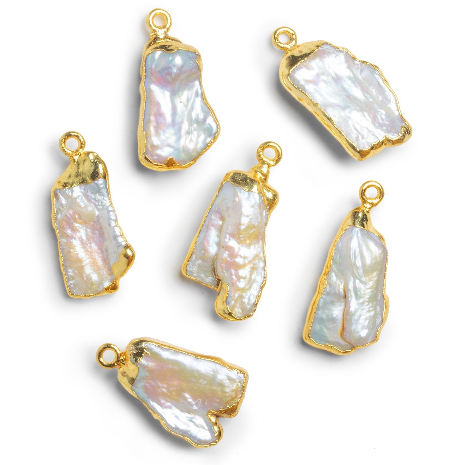 Beads average about 27x12mm with a few mm of variation possible due to the naturalistic shape of the pearls. Expect a generally elongated, rectangle-like shape on these gorgeous, high quality pieces. These white pearls show off an astonishing play of colors whose dazzle is enhanced here enveloped in our signature gold leaf. These pendants are ideal for use in bringing together an elegant necklace design, or creating bold earrings in addition to a wide array of further Jewelry Designs!