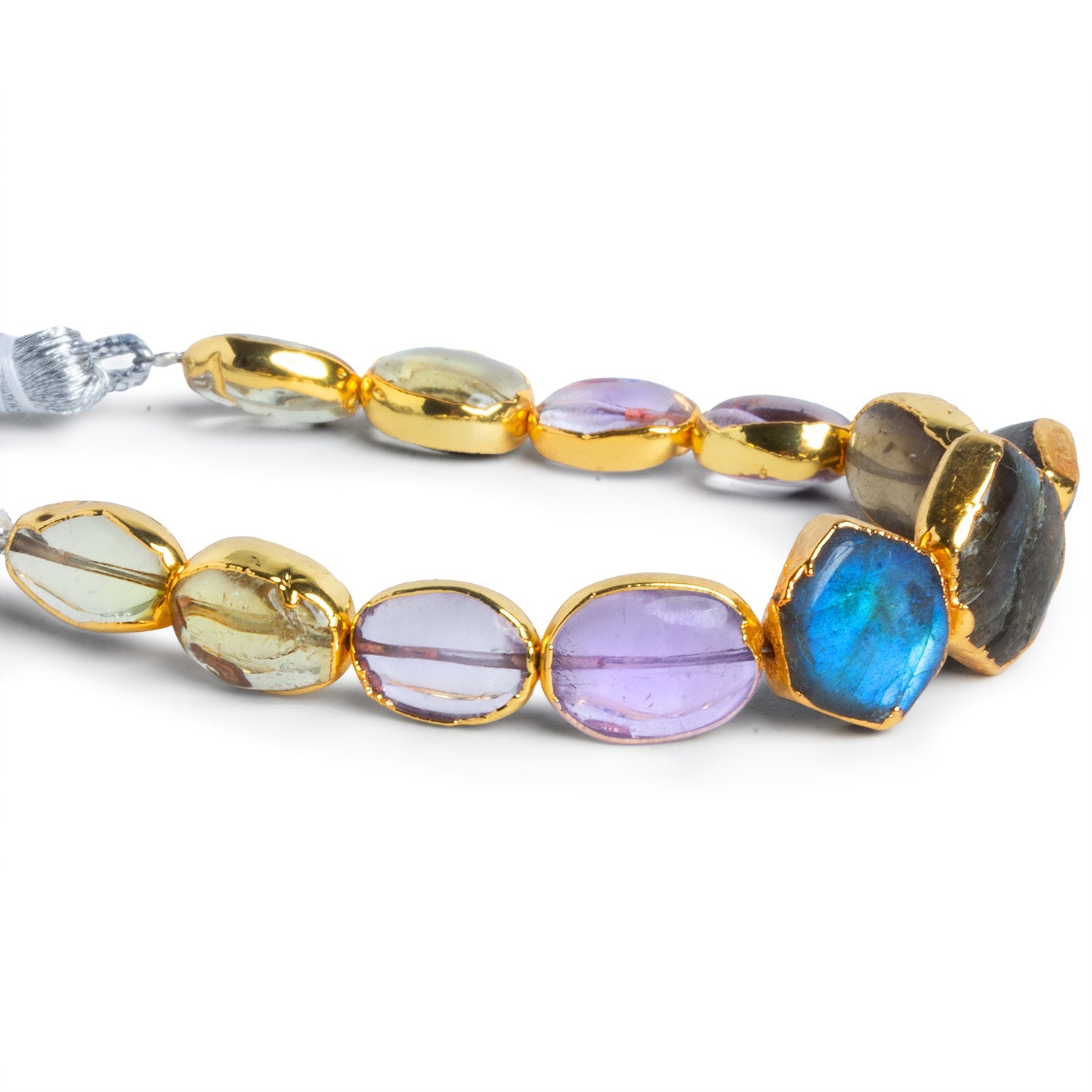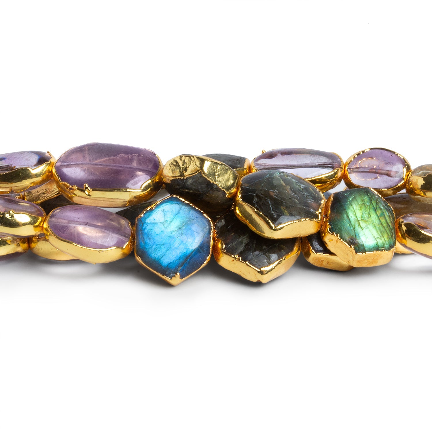 These gold leafed multi gemstone beads feature a refined mix of natural stones, including softly translucent lavender and blush-toned Quartz alongside flashes of blue-green Labradorite. Each bead is organically shaped and gently faceted, allowing natural inclusions, internal banding, and color variation to remain visible. Ranging in size from approximately 10x7mm to 15x11mm, the strand offers an appealing sense of movement and variation while still feeling cohesive.