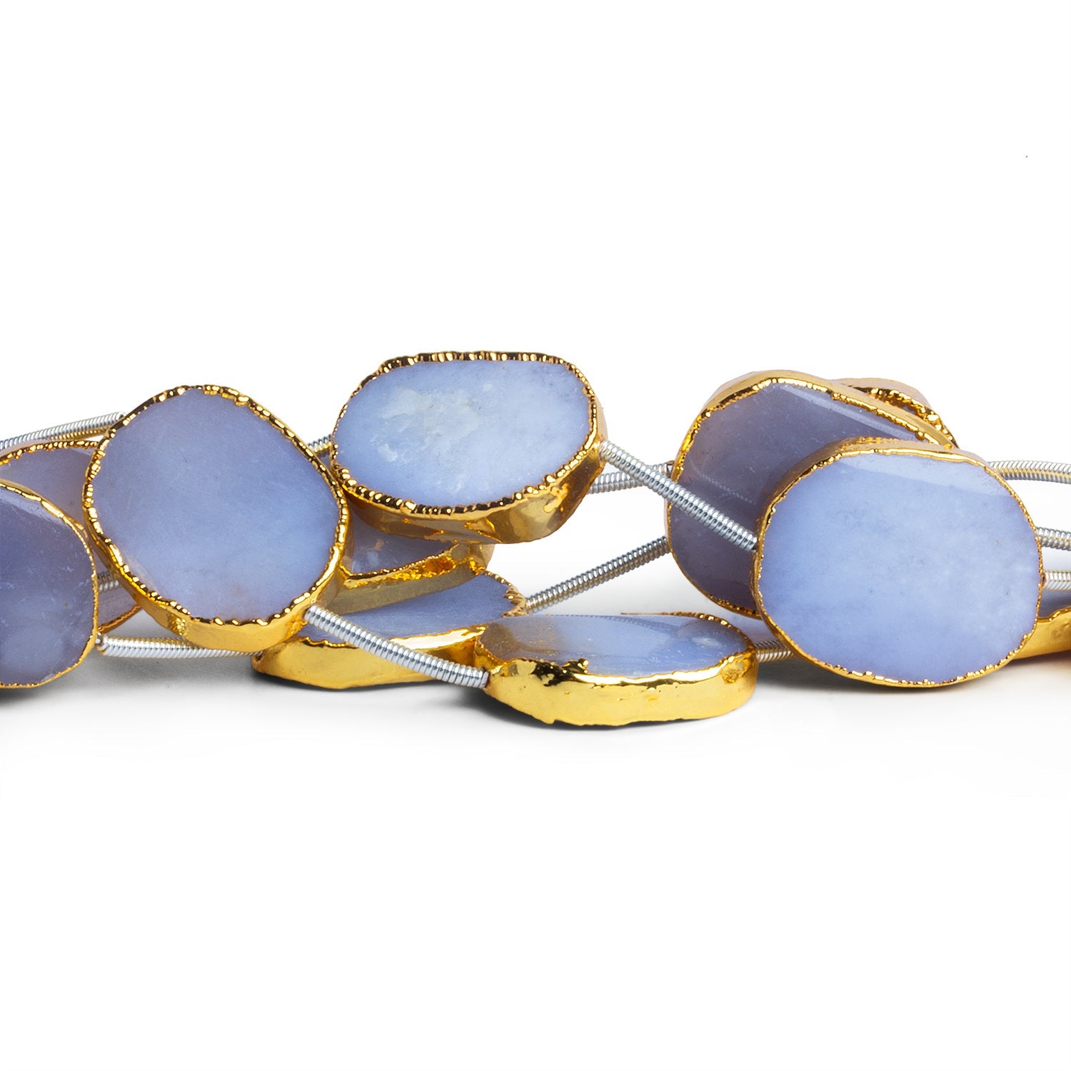 Straight-drilled through the center, these slices are ideal for necklaces, station designs, earrings, and modern mixed-material pieces where spacing and symmetry matter. Turkish chalcedony is beloved for its soothing, understated presence, making these beads especially versatile for minimalist designs, bridal jewelry, or refined everyday wear. The combination of natural stone texture and gold leafed edges offers a balance of earthy elegance and subtle luxury, perfect for designers looking to create polished pieces with an organic soul.