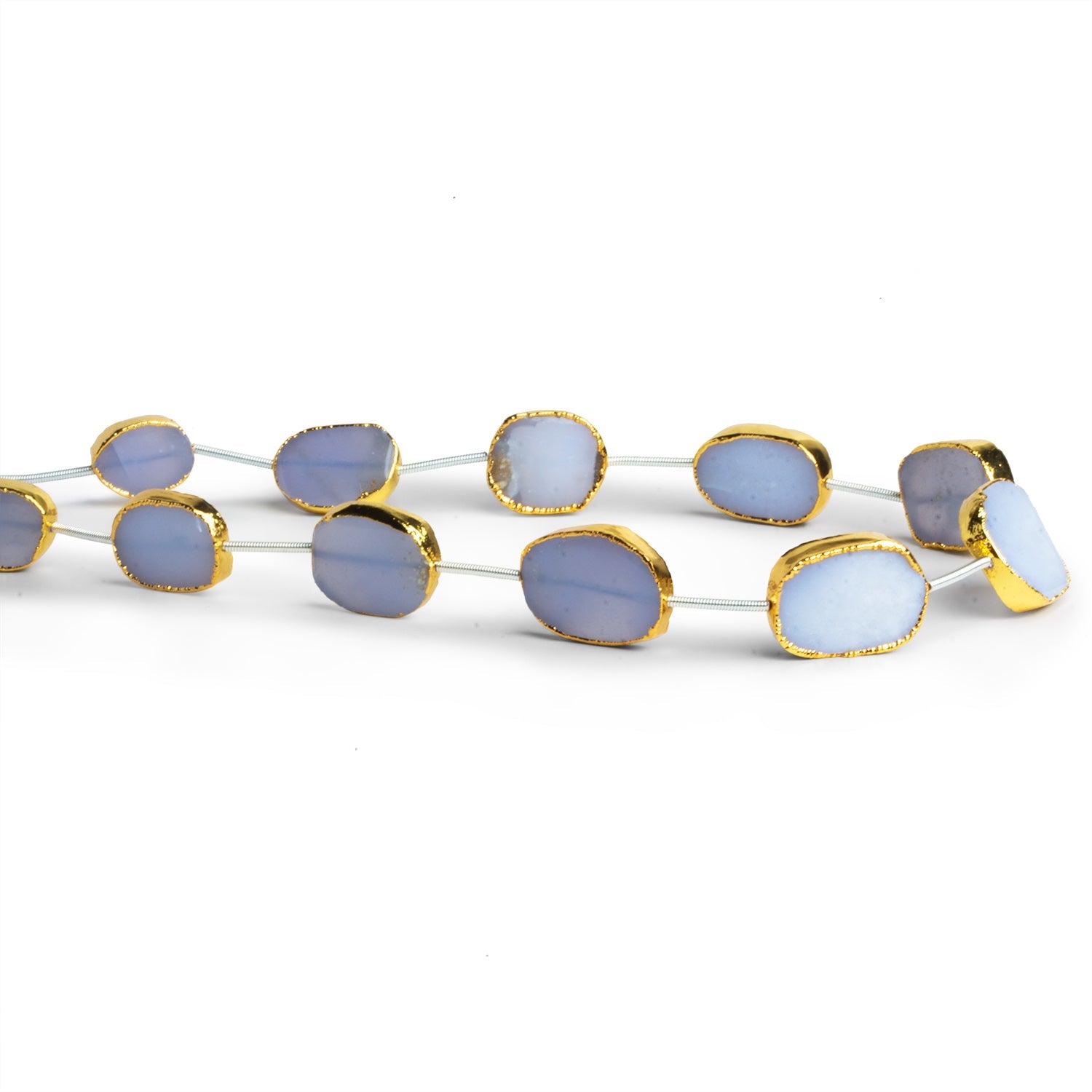 These 17x13mm Gold Leafed Turkish Chalcedony straight-drilled slices feature the unmistakable soft blue tones that Turkish chalcedony is prized for, ranging from misty sky blue to pale periwinkle with subtle internal clouding. Each slice is cut thin to showcase the stone’s natural translucency, allowing light to pass gently through the surface for a calm, luminous effect. The organic slice shapes preserve the raw character of the material, while the warm gold leafing frames each stone with a rich contrast that enhances the cool, airy color palette.