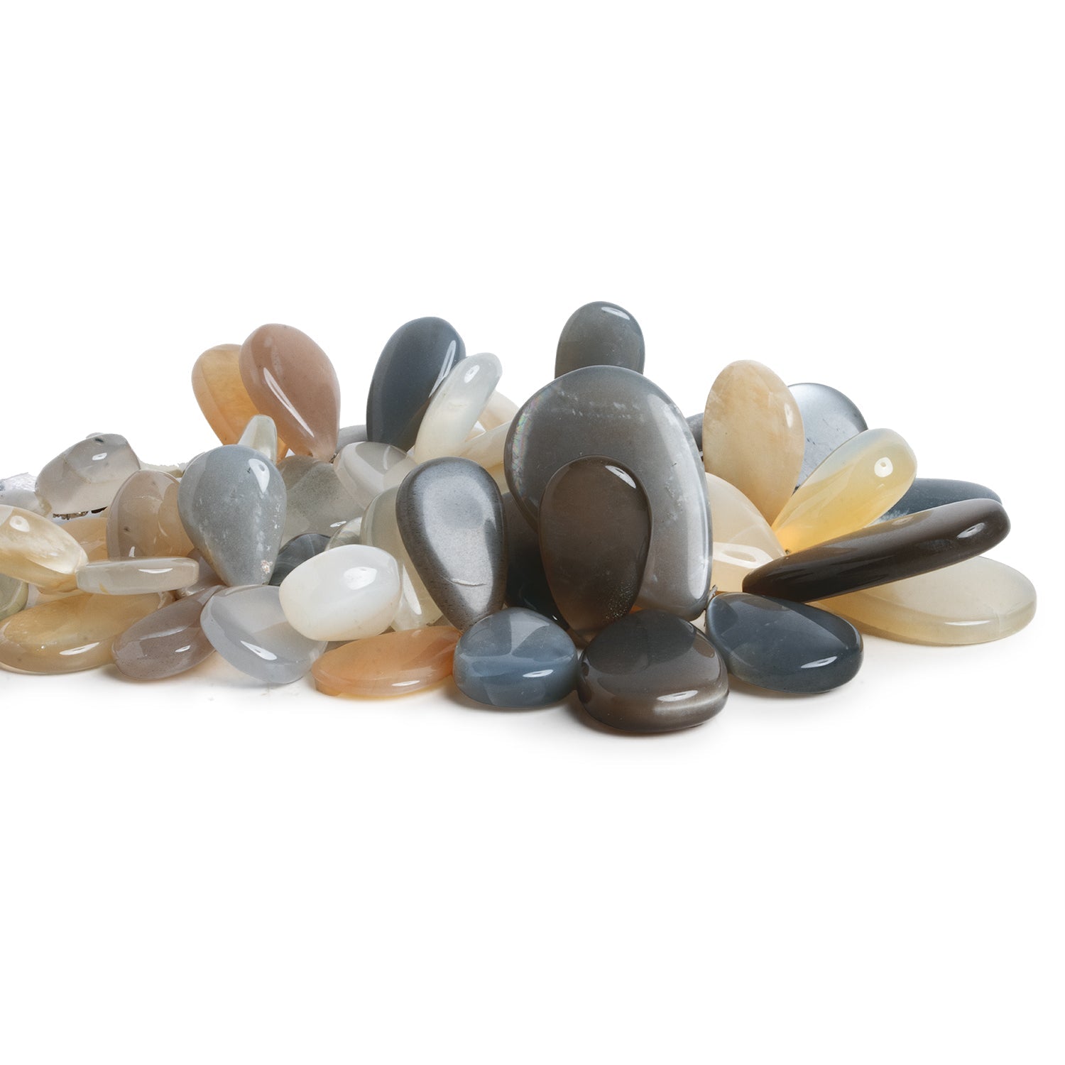 Beads measure about 16x11mm to 30x21mm. This alluring, specially curated strand features sizable pears fashioned from a colorful array of Moonstone pieces. Expect shimmering White Moonstone to mingle with peachy tones and platinum greys that vary from broad faced to thin and elongated. Fans of Moonstone will find ample fuel for their Jewelry Designing fire with these smooth polished pears ideal for necklaces, earrings and more!