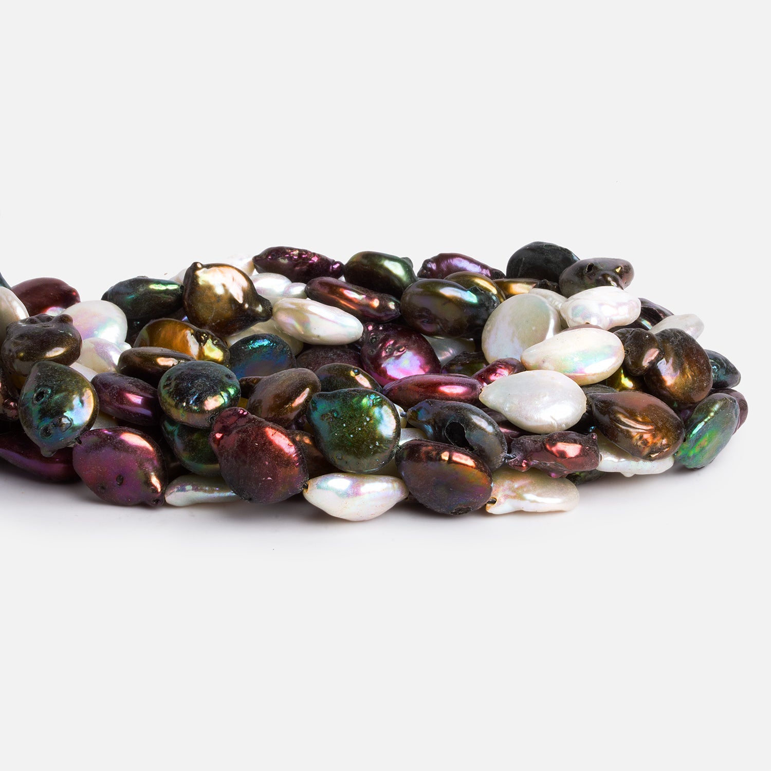 These Multicolor Coin Freshwater Pearls showcase a luminous array of hues ranging from warm golden bronze and deep aubergine to vibrant green and classic white. Each strand carries a spectrum of iridescent colors that shift beautifully in the light, making them ideal for statement jewelry with rich visual depth. Their coin-like shapes average 14x11mm, giving a bold yet refined profile perfect for necklaces, bracelets, or earrings.