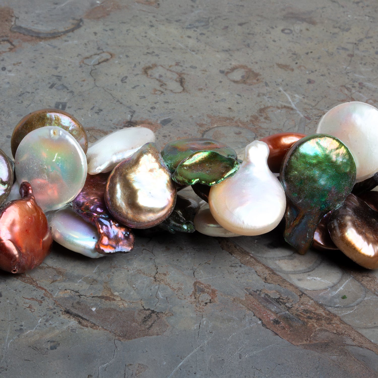 These Multicolor Coin Pearls offer a luminous blend of iridescent hues ranging from soft creams and bronzes to greens, violets, and copper tones. Each pearl features a unique high-luster finish that shifts beautifully in the light, capturing an enchanting rainbow effect across its surface. Their flat coin shape provides a versatile base for modern, statement jewelry designs while retaining the organic beauty of freshwater pearls.