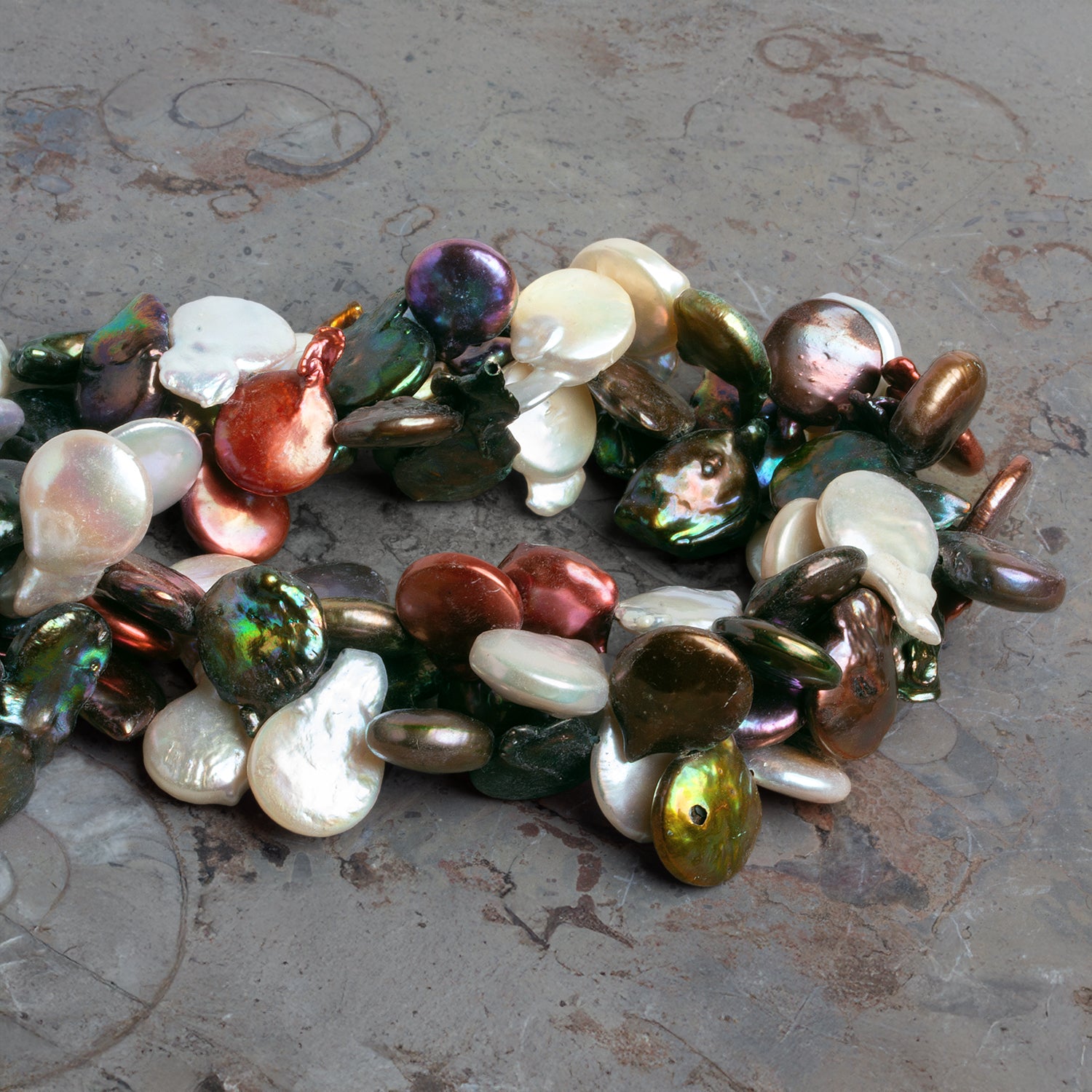 These pearls are substantial enough for focal points while still maintaining a graceful elegance. Their varied tones and natural surface textures make each strand distinct, ideal for designers seeking bold, one-of-a-kind creations. Whether used for necklaces, bracelets, or earrings, these multicolor coin pearls bring a striking, iridescent character to any jewelry design.