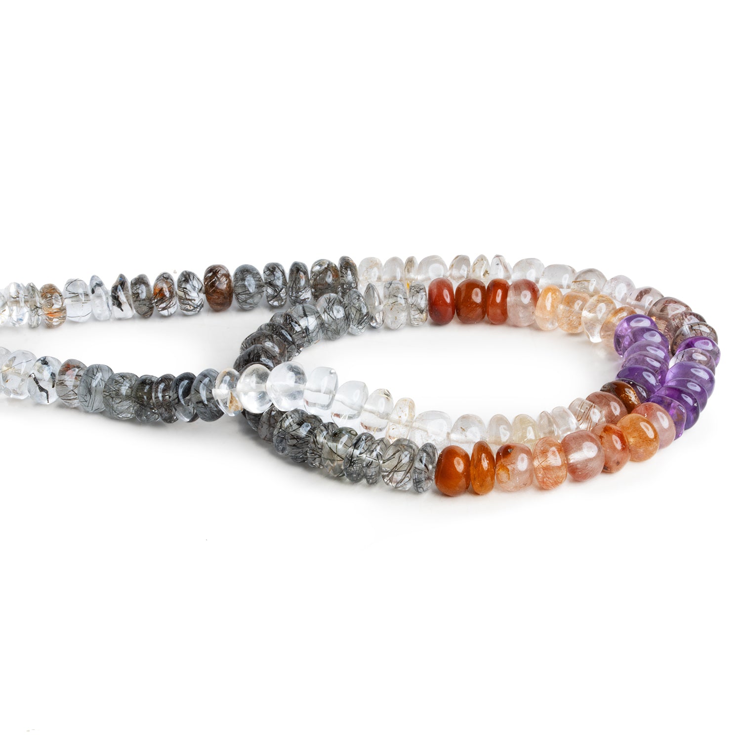 Beads measure about 6.5mm in diameter. These specially curated strands combine Amethyst, black tourmalinated quartz and copper rutilated quartz to mesmerizing effect. Expect a range of intriguing textures evident on translucent beads. These smooth polished rondelles are destined to dazzle in a wide range of jewelry designs, from necklaces to earrings and more.